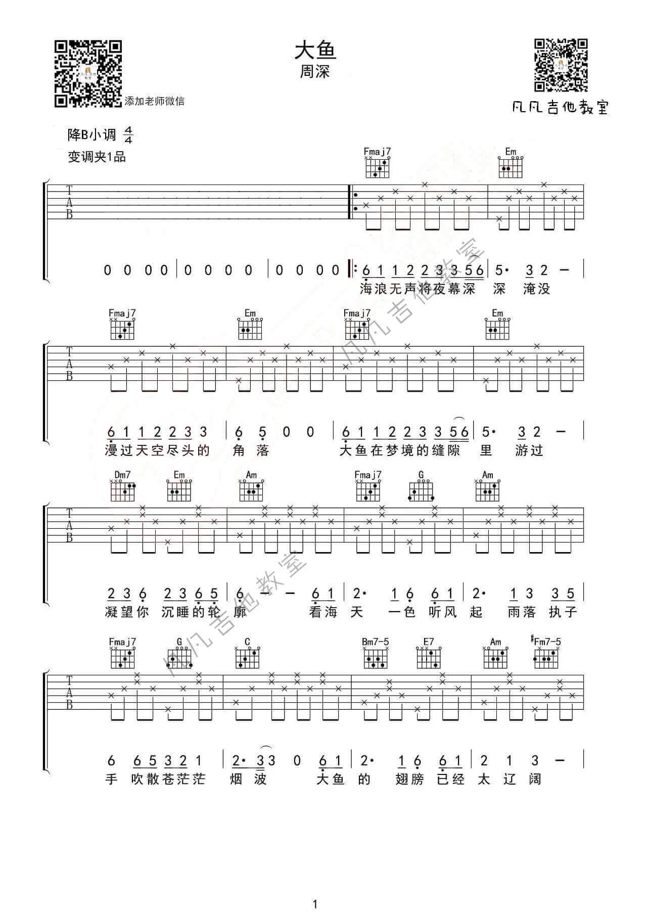 曲谱介绍: 大鱼吉他谱采用了B调指法,由凡凡吉他教室做谱完成。《大鱼》是由周深演唱的歌曲,是动画电影《大鱼海棠》的印象曲,歌曲旋律悠远绵长,歌词画面感丰富又不乏动人细节,从恢弘场景过渡到细腻情感,如诗一般直戳人心。副歌旋律渐渐扬起,辽阔空灵,歌词更是直抒椿的情感,带着几分中国传统文化中的古典哀愁,让人不禁沉醉在《大鱼》的音乐和故事中。这首歌曲也秉承了悠远的国乐之风,余音绕梁,不绝于耳。