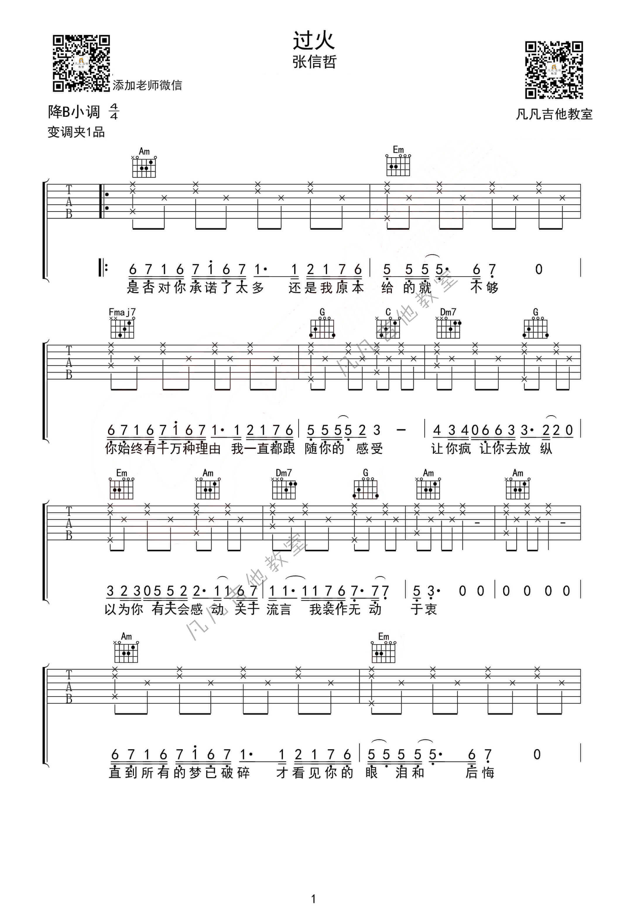 曲谱介绍: 过火吉他谱采用了B调指法,由凡凡吉他教室做谱完成《过火》是台湾歌手张信哲演唱的一首歌曲,歌曲叙述了一个对感情忠诚的男孩爱上了一个玩弄感情的女孩,最后女孩越轨了,自然而然地,在感情的方面上,男孩付出了最多,但是却输得最重。不过男孩并没有对女孩作出什么报复。反而宽容以对,宽容精神也成为了这首歌的中心。
