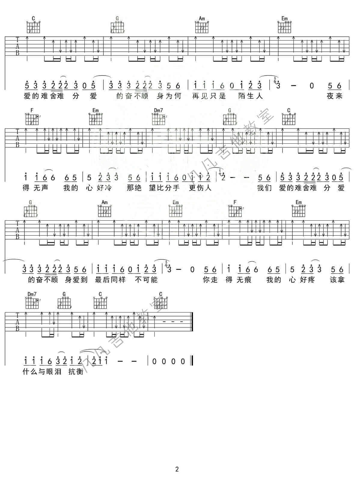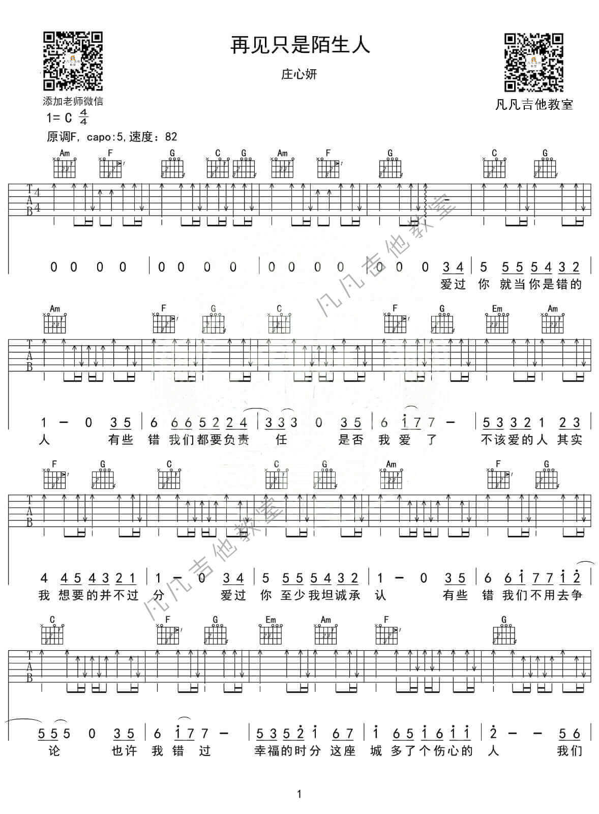 曲谱介绍: 再见只是陌生人吉他谱采用了F调指法,由凡凡吉他教室做谱完成。《再见只是陌生人》是歌手庄心妍演唱的歌曲,都说曾经相爱的人,因为爱过,做不了敌人。因为恨过,也做不了朋友!所以只能是(熟悉的)陌生人。《再见只是陌生人》讲述的是一个悲伤的故事,哀而不伤的演绎,是对往事的感怀,对现在的慰藉。 庄心妍的歌有一种不动声色的忧伤,在不经意间让听者淹没其中。
