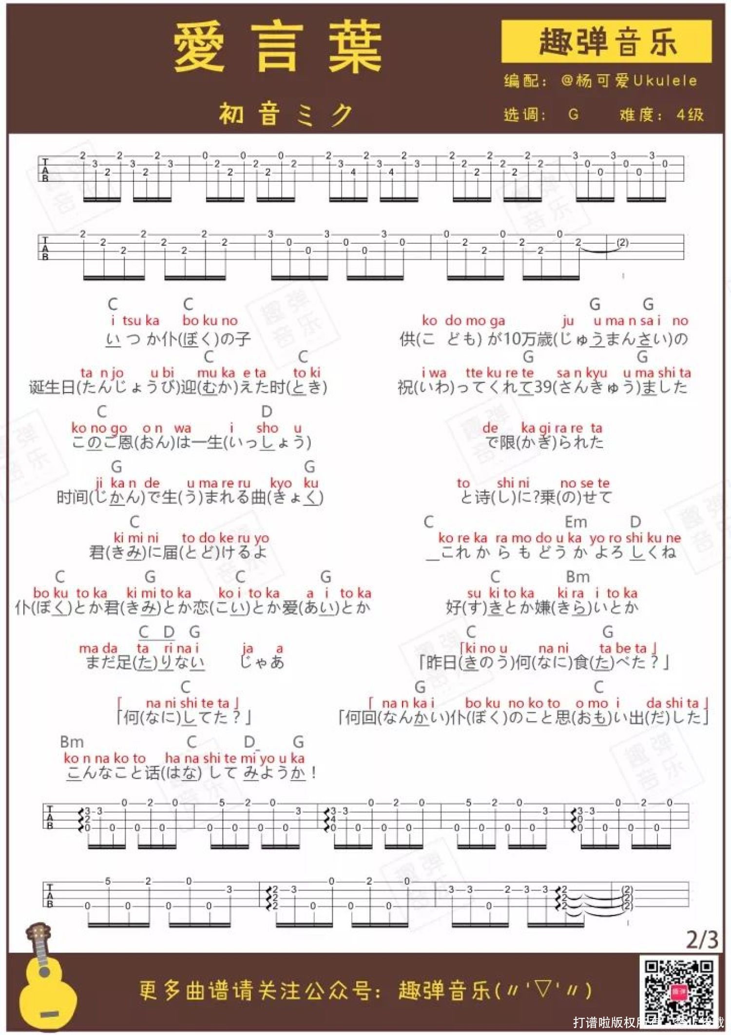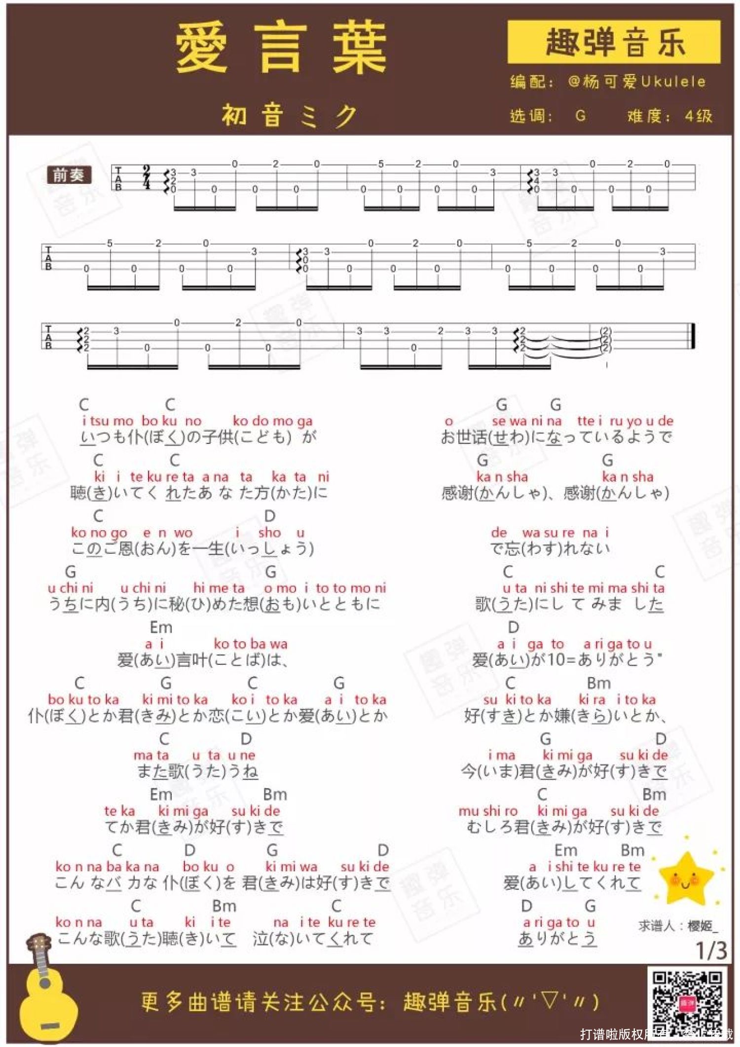 爱叶言尤克里里谱