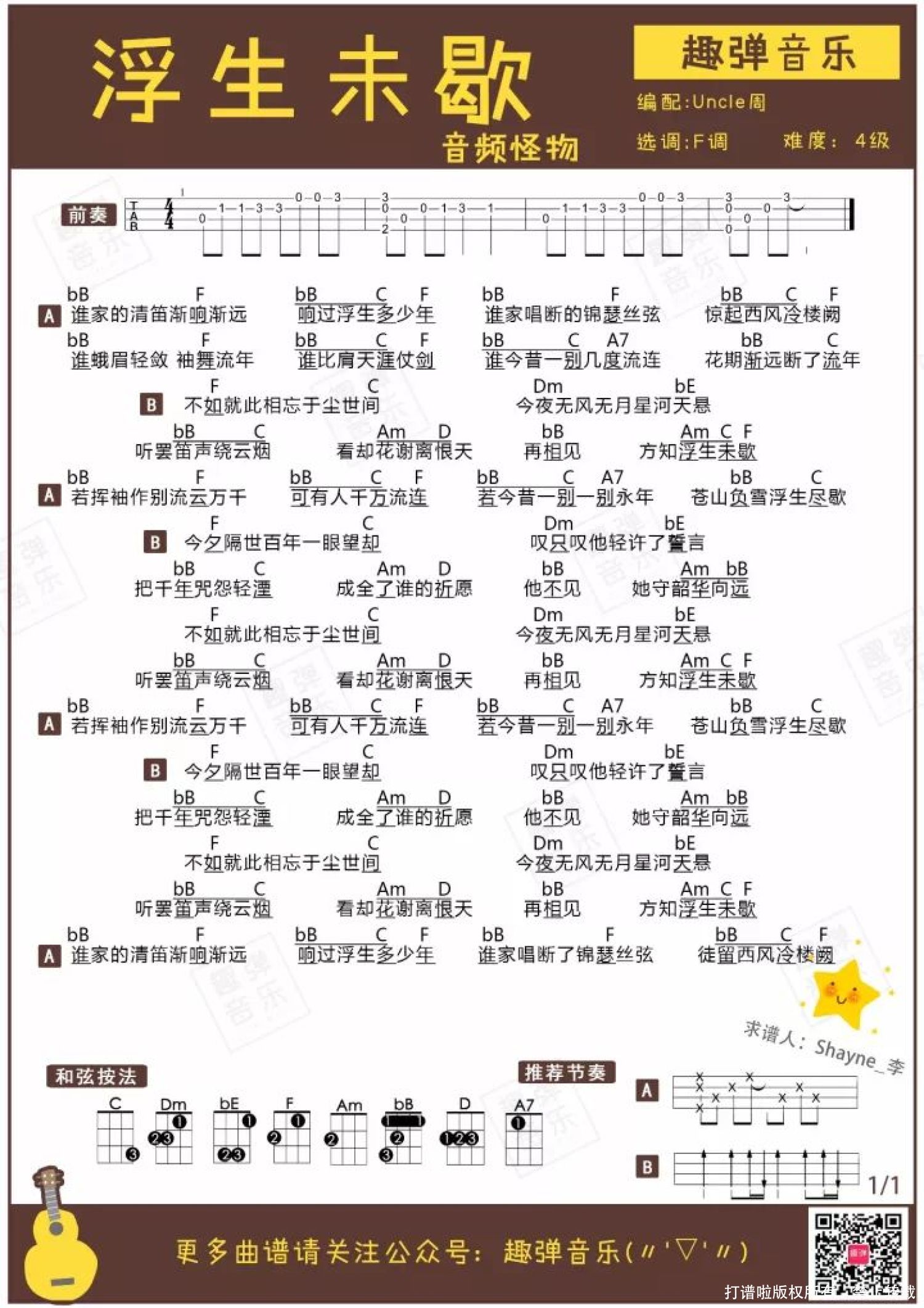 曲谱介绍:     ● 由古风音乐团体"墨明棋妙"成员HITA和歌手双笙等人翻唱过的一首歌。 ● 此曲是为纪念《仙剑奇侠传四》中的云天河与柳梦璃所作。 《浮生未歇》原曲为一首叫做《桜色舞うころ》的日语歌,有多个中文填词版本。 这首歌被怀旧联盟做的仙四的剧情动画作为片尾曲,笛声响起的时候,回想起片尾mv四位主角一同看烟花的场面,温馨而催泪。   弹唱曲谱