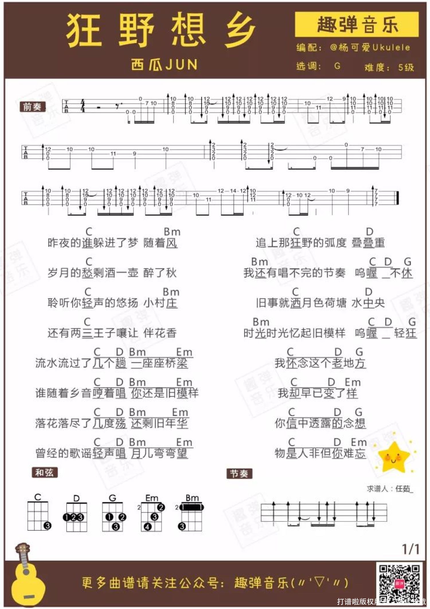 曲谱介绍: ● 由西瓜JUN作曲并演唱的一首歌。 ● 是歌曲系列“归乡三梦”中的最后一梦。 西瓜JUN创作的“归乡三梦”分别为《秋声叹》、《故里》和这首《狂野想乡》。 西瓜JUN说:“《狂野想乡》是这个系列里唯一一首不是我作词的歌。作曲曲风上也和前两首有明显的不同。可能,是我潜意识里不想这个系列以一种悲伤的情绪结束吧,也是我一路走来,心态的变化。”    弹唱曲谱