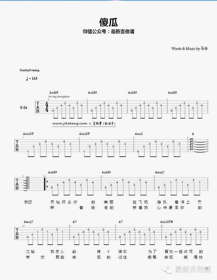 曲谱介绍: 傻瓜吉他谱由最新吉他谱编配完成。傻瓜,这是一首民谣,他是一首在讲故事的民谣,歌手用他沧桑的忧郁的声音,在述说着一个故事,他唱出了民谣该有的味道,却也不缺乏歌手自身独特的味道,这是一首相对而言比较小众的歌曲,没有太多的人发现他,但是听过他的人一定会爱不释手的。
