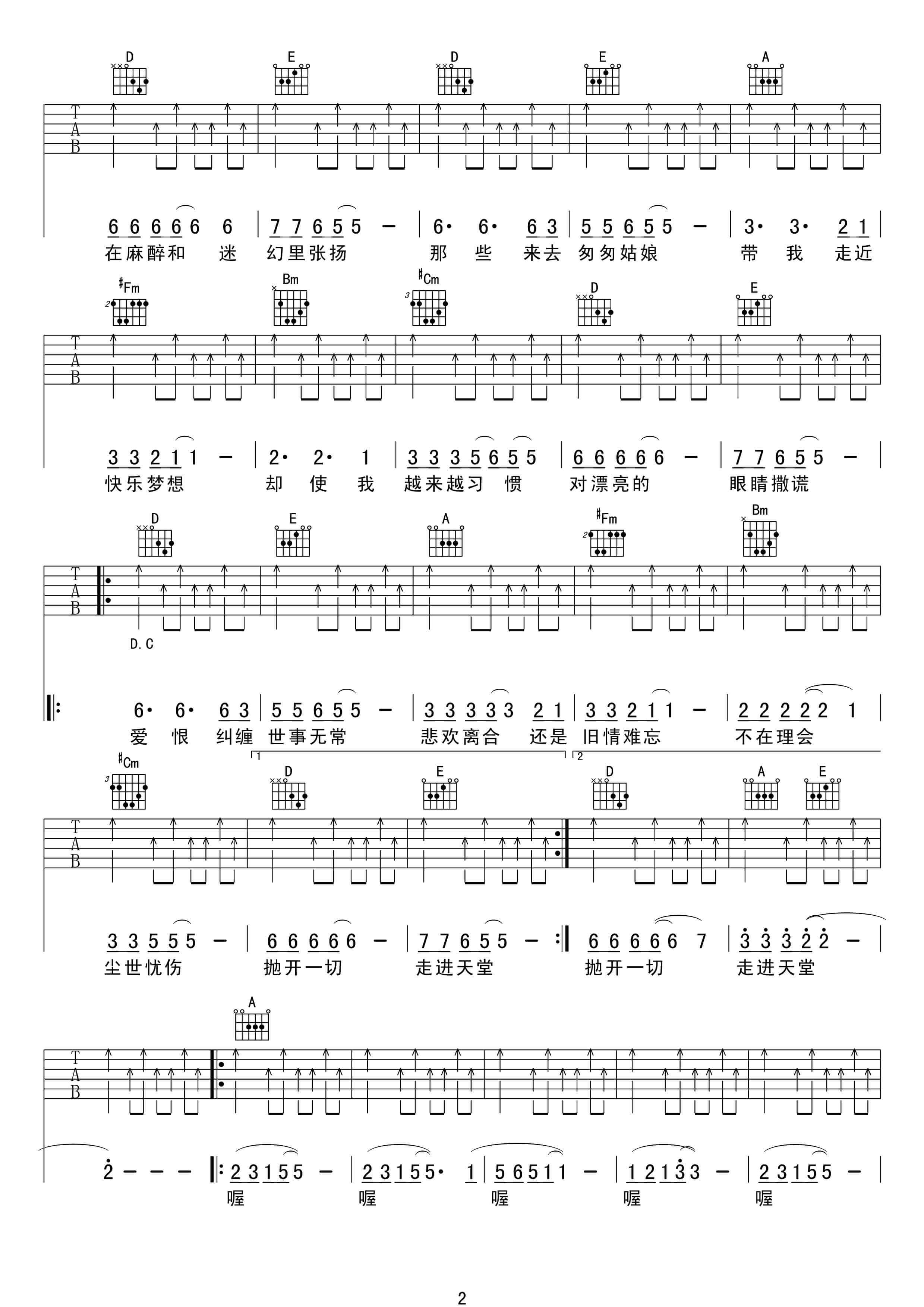 曲谱介绍: 天堂吉他谱采用了A调指法,由刘传编配完成。《天堂》是由唐朝乐队所制作和表演的一首歌,在现代流行音乐面前,这只乐队还有这首歌并没有那么的出名,很小众的一首歌曲,但他们是热爱创作的,这首歌略微带着一点摇滚。
