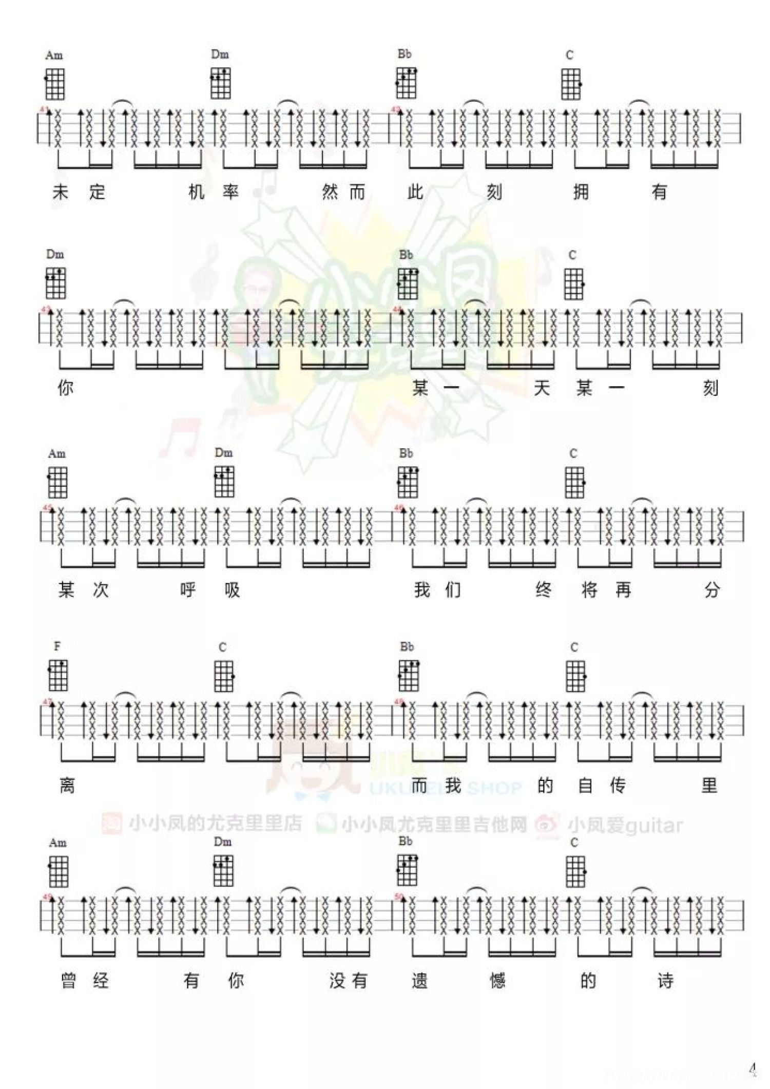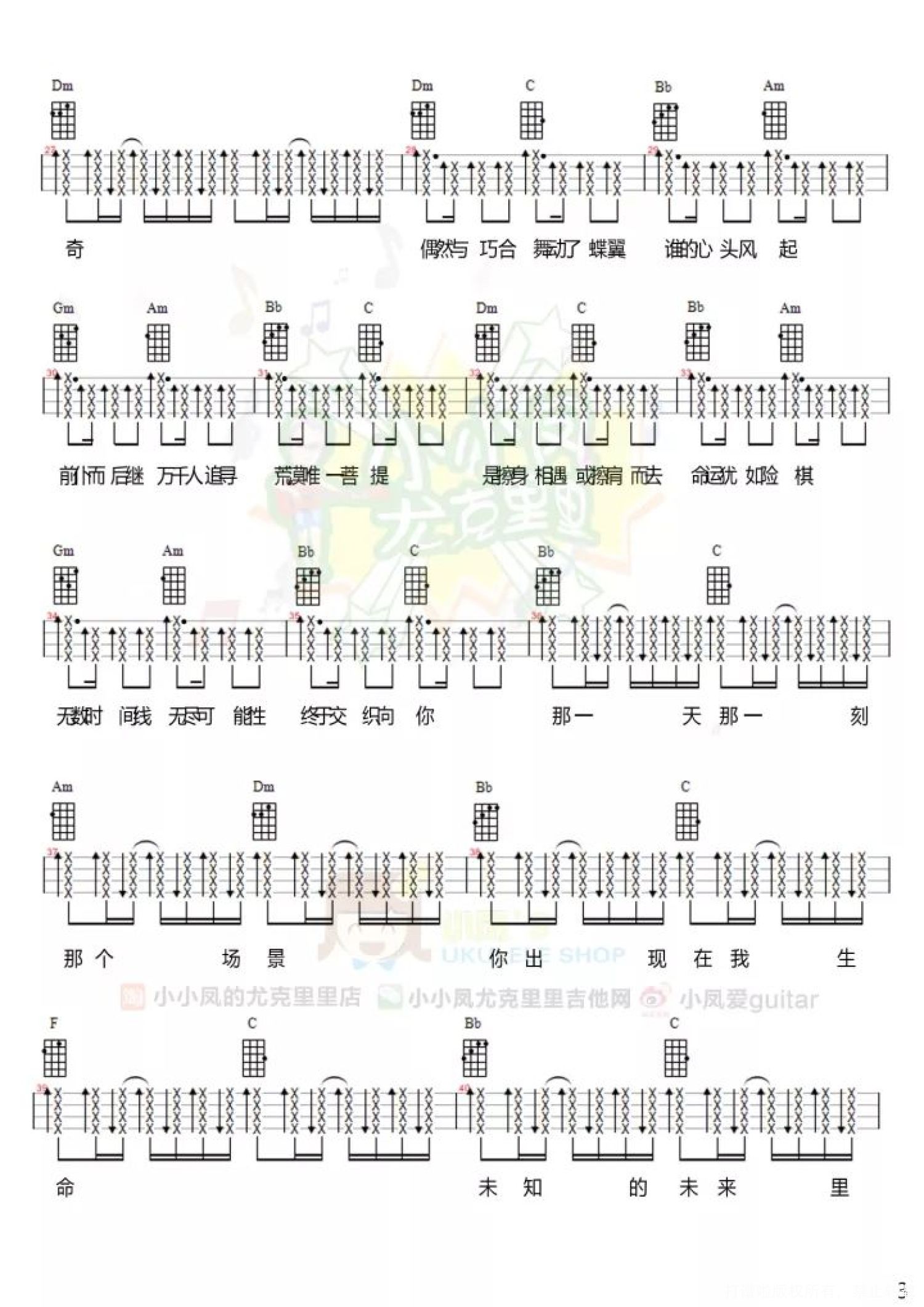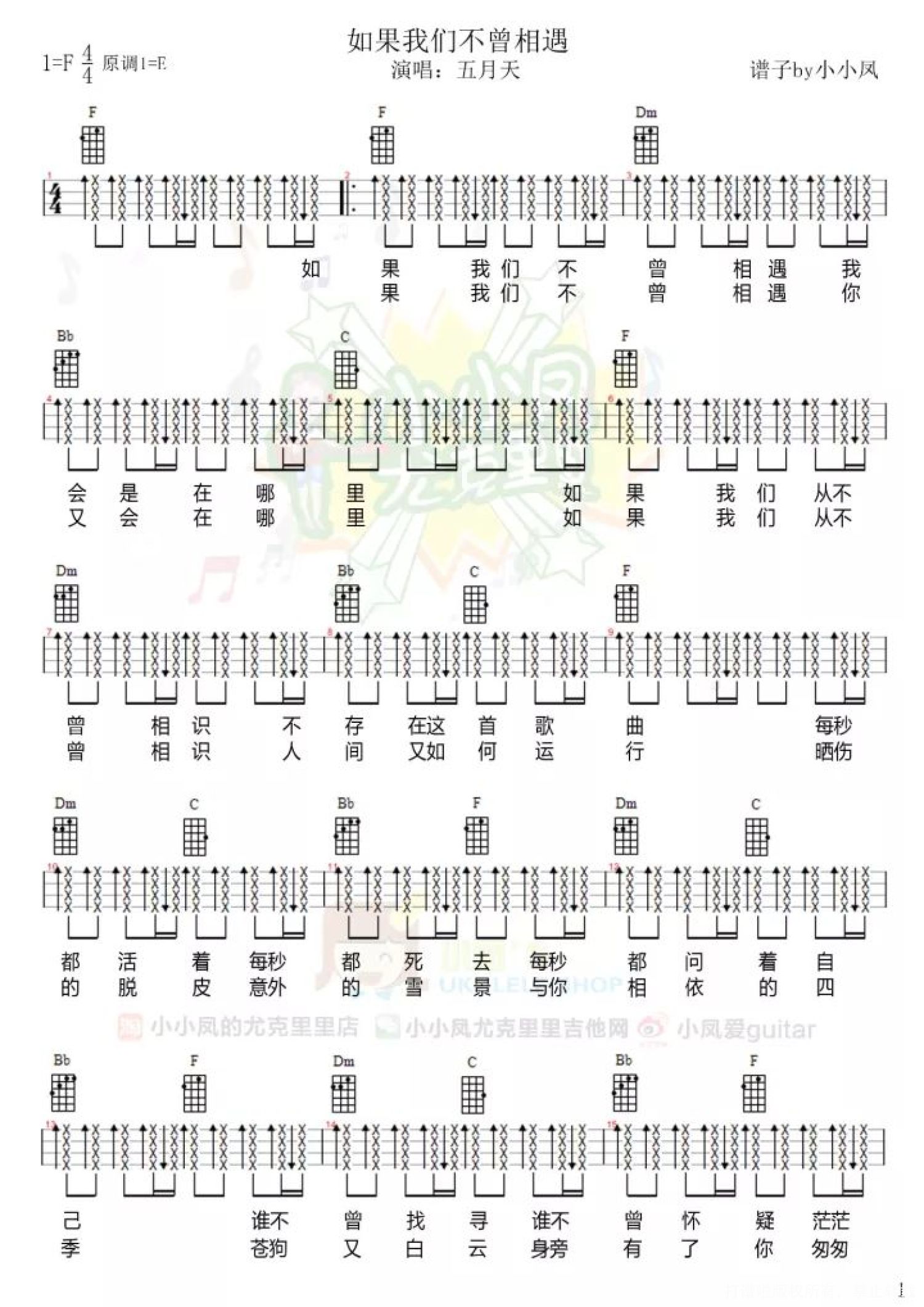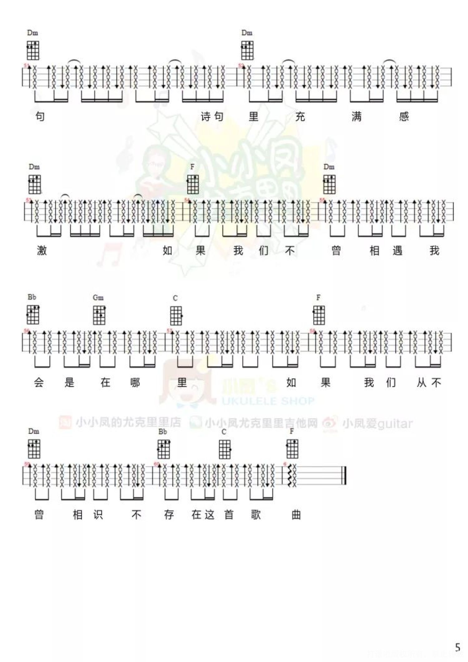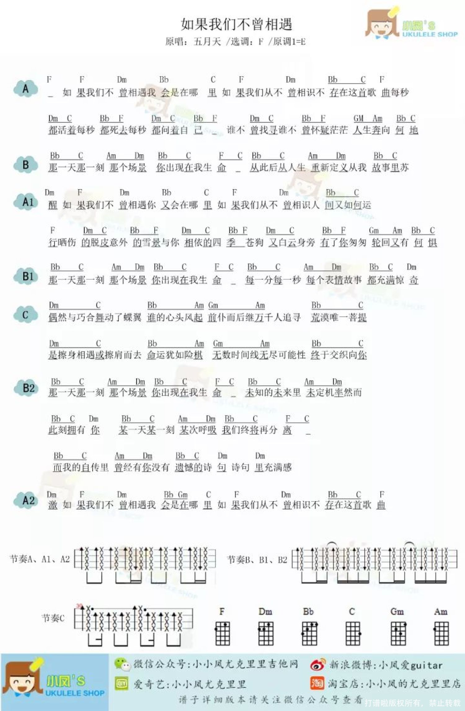 曲谱介绍: 《如果我们不曾相遇》尤克里里谱 和弦谱: 详谱: 如果我们不曾相遇,我也不会认识你,也不会拥有这么多美好的回忆 如果我们不曾相遇,我就不会念念不忘,而你也不会对我厌烦至极; 如果我们不曾相遇,我现在是不是就不会独自相思泛滥成灾; 如果我们不曾相遇,我可能还是几年前那个懵懂天真的小女生; 如果我们不曾相遇,我们的人生是不是都会不一样 如果我们不曾相遇,你又会在哪里 每个人的一生在每个时间点都会遇到不同的人 有些人只是你生命中的匆匆过客,就像两条交叉线 相交于一个点,留下某一段回忆,而后又越走越远 有些人就成了你生命中重要的存在,会一直陪着你 就算不会每天腻在一起,可是你知道 只要你需要,TA永远会毫不犹豫的伸出手 是不是每个人的生命里,都会有一个不会老去的人,一直一直陪着你 可能TA并不是最初陪伴在你身边的人 可是TA却是往后会一直陪着你的那个 如果我们不曾相遇,我们也不会有那么多美好的回忆 我们一起走过的街道,一个看过的电影,一起寻觅过的美食,一起争吵过的琐碎,一起笑过哭过争吵过...... 就算回忆并不是全部都那么美好 但是还是谢谢我们曾相遇 开心过幸福过就好