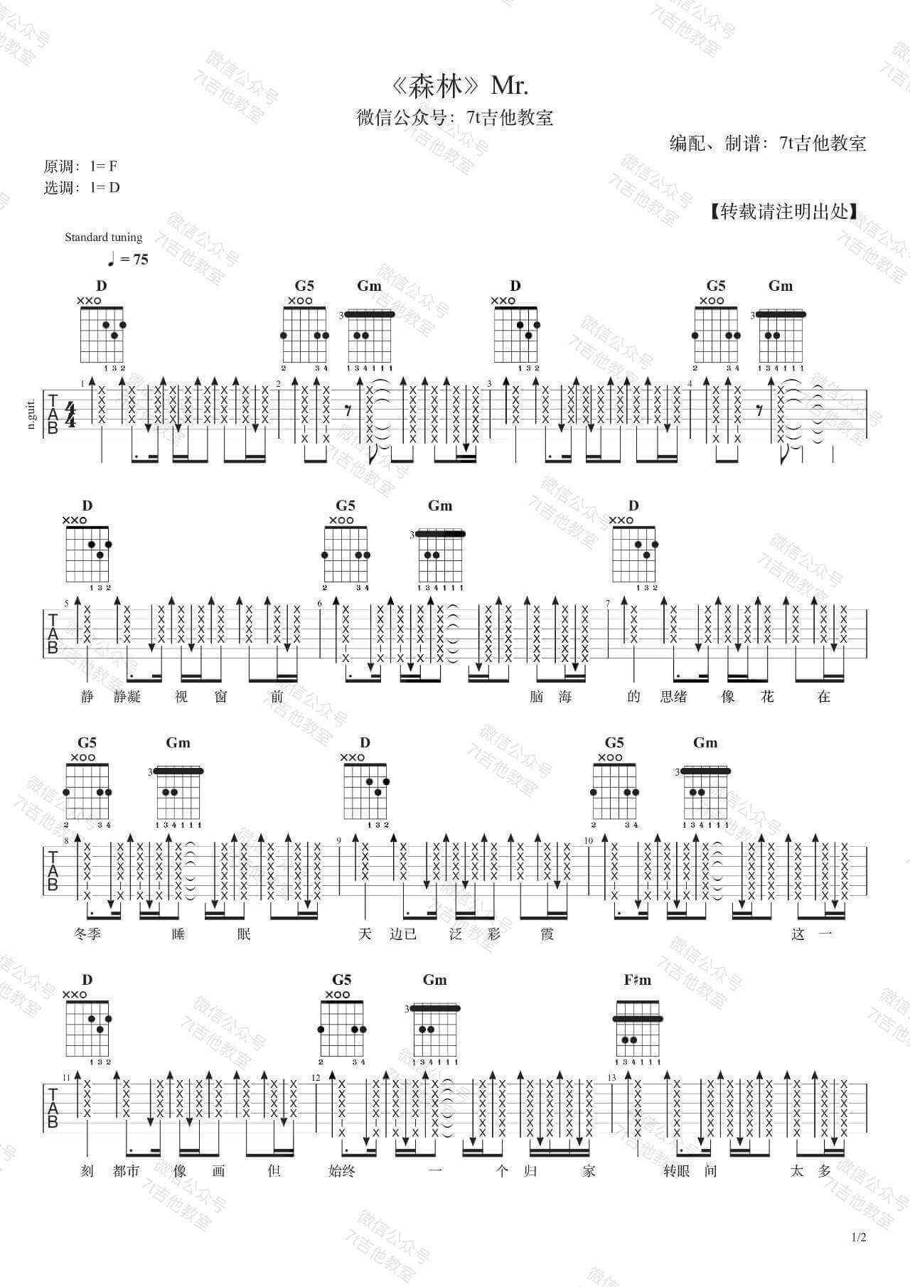 森林吉他谱 - Mr. - D调吉他弹唱谱