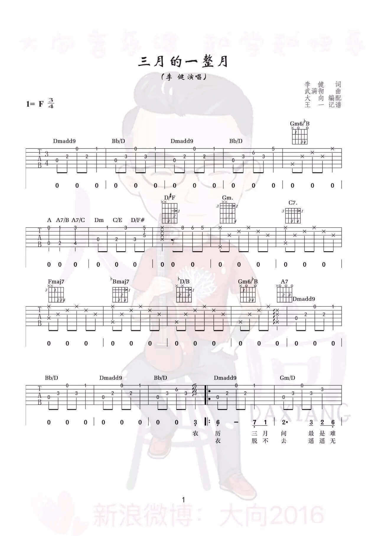 三月的一整月吉他谱 - 李健 - F调吉他弹唱谱
