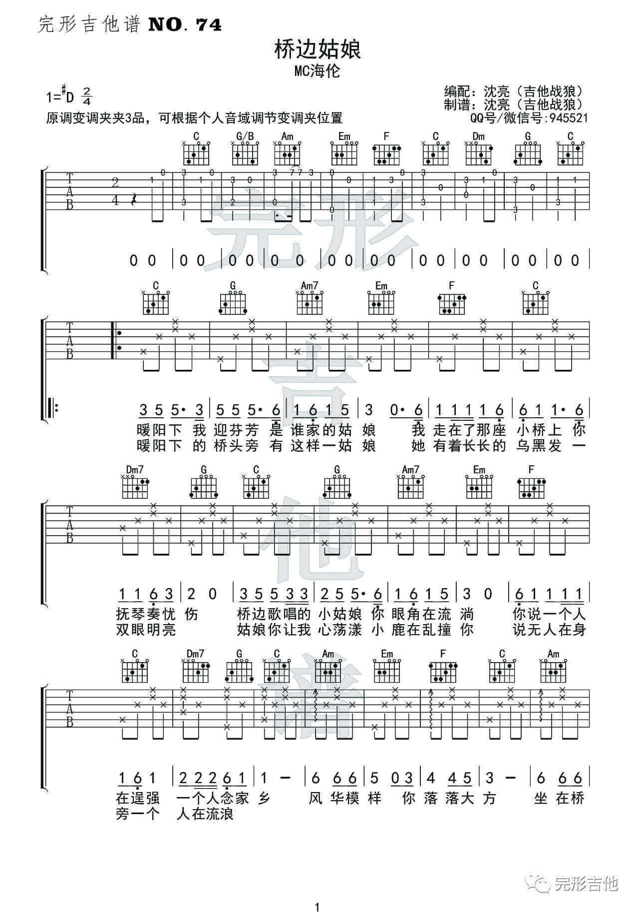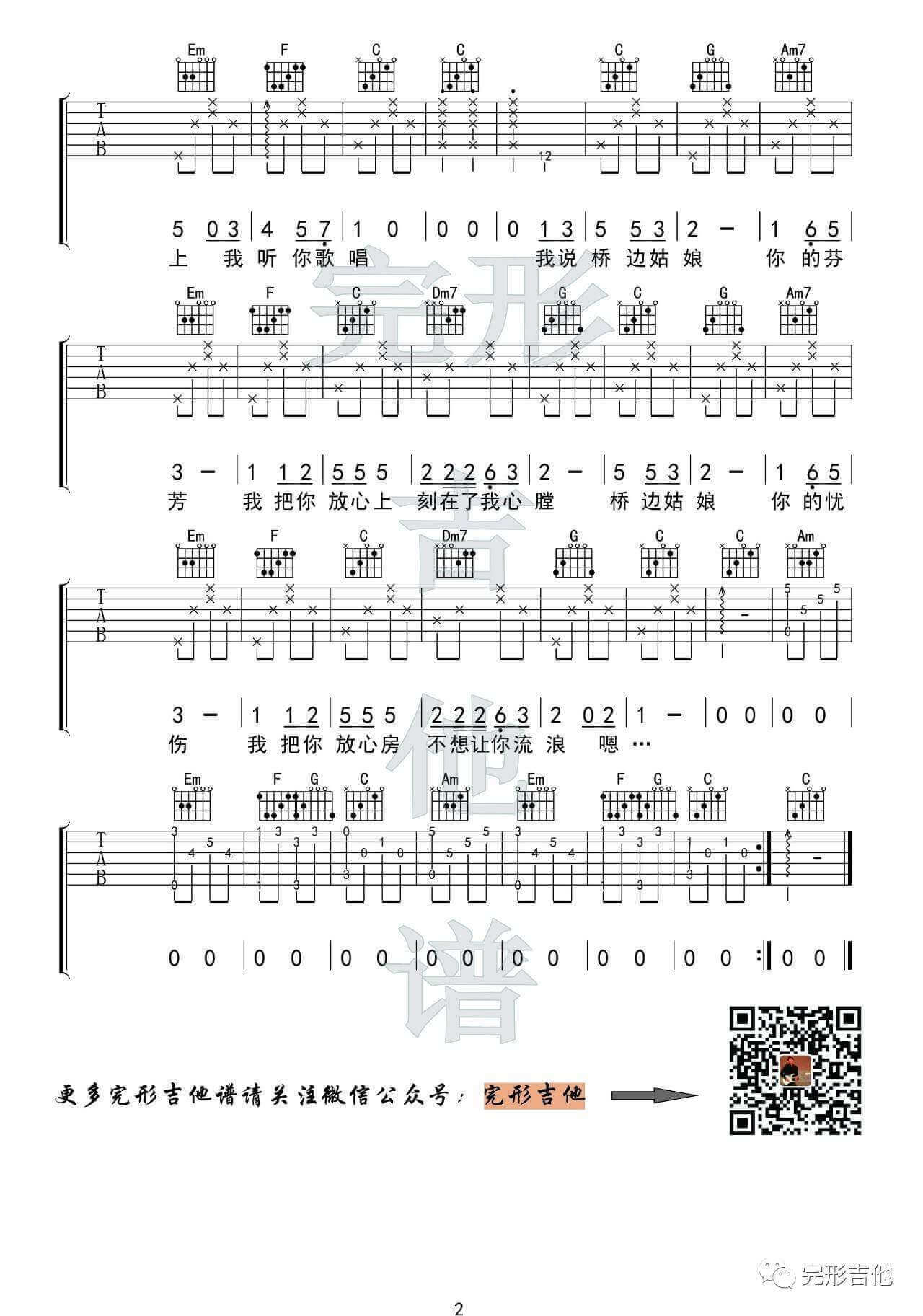 曲谱介绍: 桥边姑娘吉他谱采用了C调指法,由完形吉他编配完成。《桥边姑娘》这首歌的歌词和旋律没有华丽和唯美的氛围,平淡的节奏来演绎,但是他一一述说的故事却让人觉得唯美浪漫。 吉他弹唱演示及视频教学