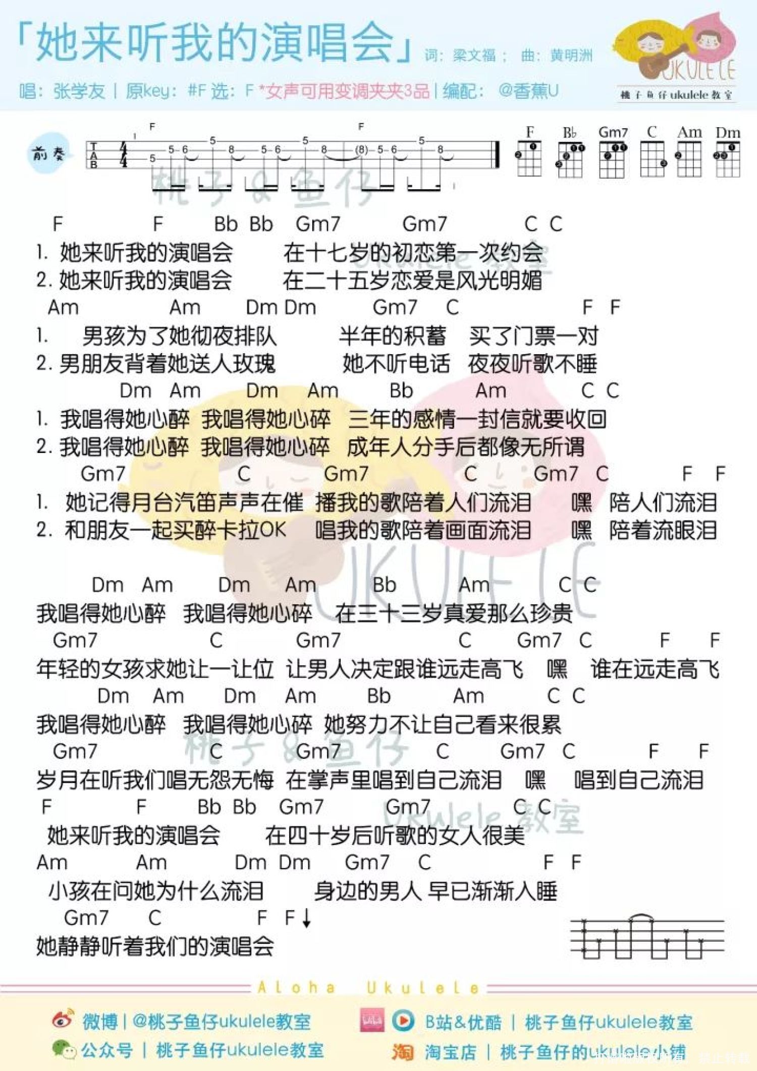 曲谱介绍: 无论心碎还是流泪 爱过就好 让这首张学友演唱的《她来听我的演唱会》 陪伴大家度过今夜 ● 歌神张学友演唱会唱《她来听我的演唱会》,大屏幕捕捉到一对对情侣的镜头,又甜蜜又感动,一定要和心爱的人,看一场“他”的演唱会   周杰伦演唱会演绎 ● 周杰伦在香港举行“魔天伦2”巡回演唱会,为致敬歌神张学友,杰伦自弹自唱《她来听我的演唱会》,出乎全场意料,歌神竟然就坐在台下,成为最重量级的座上嘉宾,而杰伦也特别把“她来听我的演唱会”歌词改成“张学友来听我的演唱会”,当镜头给到观众席里的张学友时,全场沸腾尖叫声不断。    《她来听我的演唱会》尤克里里谱