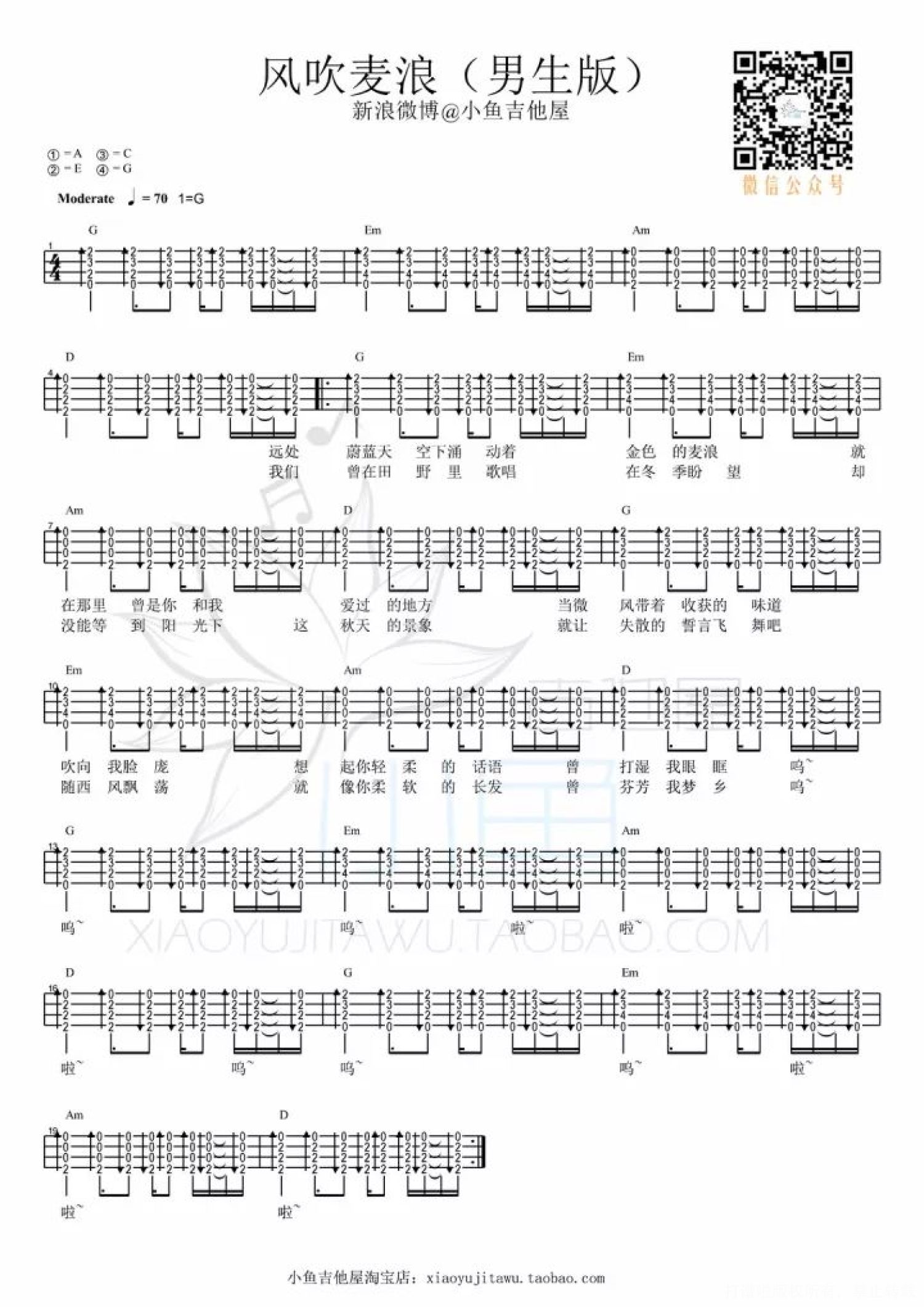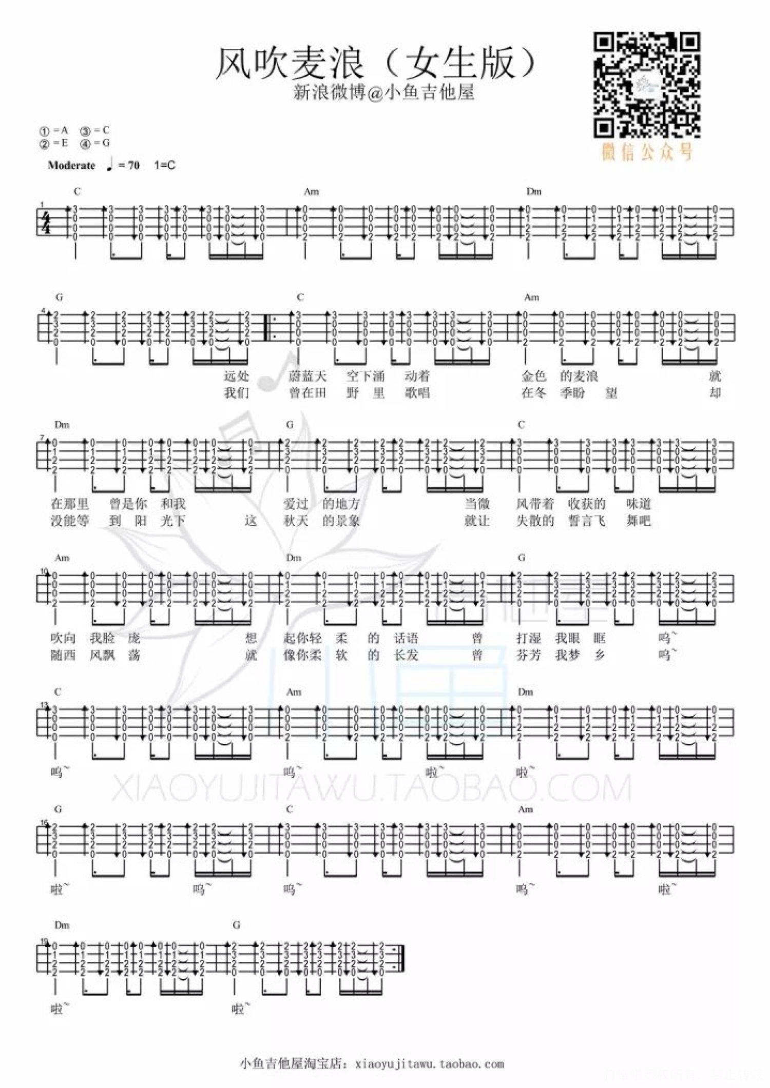 曲谱介绍:   《风吹麦浪》尤克里里弹唱教学 完整 / 曲谱