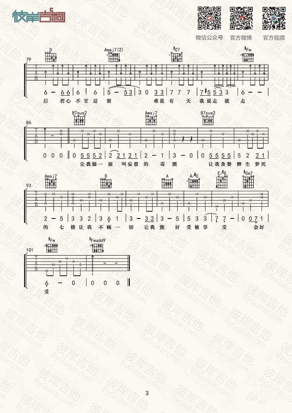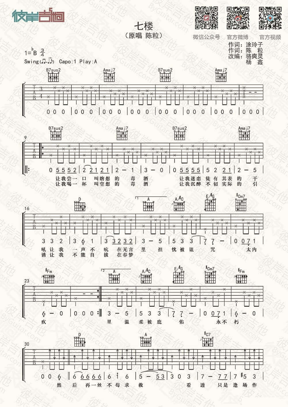 曲谱介绍: 七楼吉他谱采用了A调指法,由彼岸吉他编配完成。陈粒的歌很难被理解,她用她独特的极具辨别度的嗓音演绎每一首歌曲,但你一旦喜欢她,你一定无法自拔。陈粒有许多被大家熟知的歌曲《光》《奇妙能力歌》等,我就是一个陷入其中的人,陈粒演绎歌曲有种在梦境里的自言自语,而且情绪上让人难以琢磨,陈粒的歌,很小众,她是宝藏歌手,她的歌曲也很宝藏,想被人小心翼翼地保护起来。