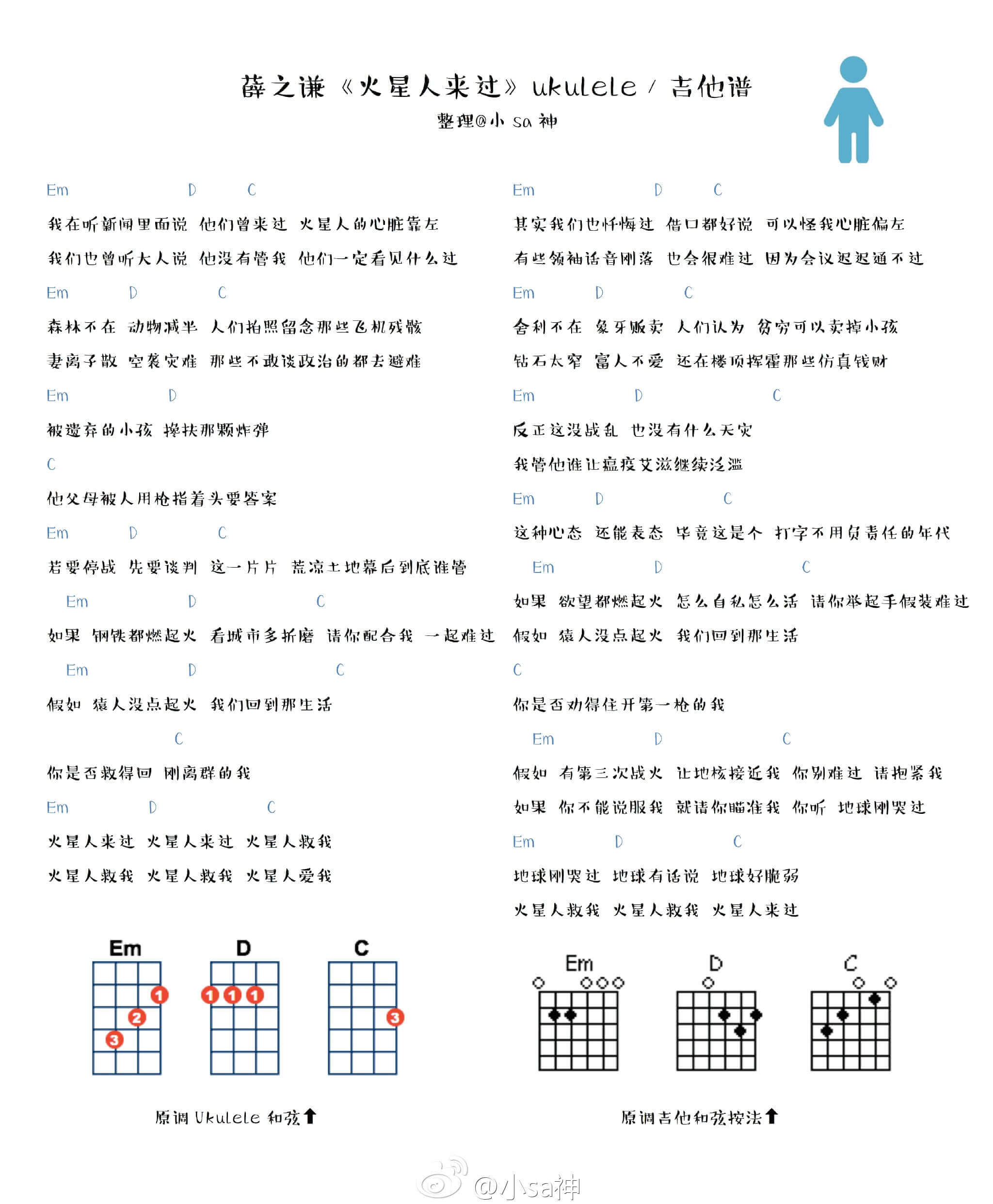 曲谱介绍: 火星人来过吉他谱采用了C调指法,由小Sa神编配完成。有人说我最怕听薛之谦的歌,他仿佛可以发掘人们内心中最柔软的地方,很多人说自己戒不掉薛之谦的歌,他的歌越听越难受,越听越感同身受,有一瞬间都认为自己是他歌中的主人公。 吉他弹唱演示及视频教学