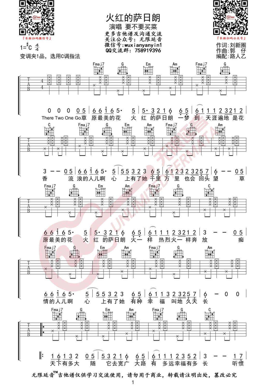 火红的萨日朗吉他谱 - 要不要买菜 - C调吉他弹唱谱