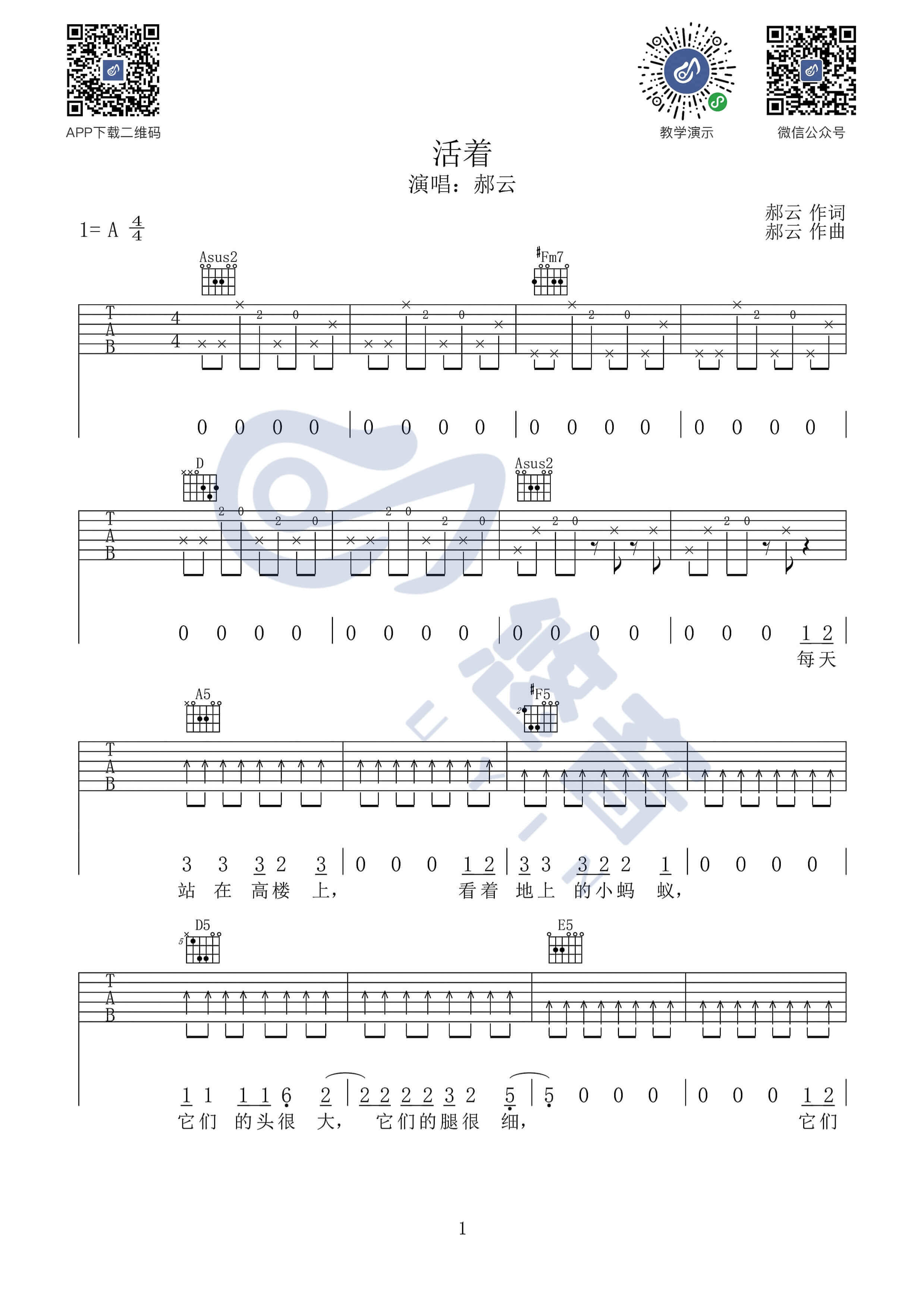 曲谱介绍: 活着吉他谱采用了A调指法,由悠音吉他课堂编配完成。《活着》这首歌曲用细腻的词语组成一幅人生的画卷,搭配着摇滚的音乐,让人越发觉得自己对活着有了更新的认识,郝云的歌从“天马行空”的肆意挥洒到“如果来生还能遇见你”的唏嘘感慨,仿佛跨过了一生的长河,没有为什么,我们就是要好好“活着”!