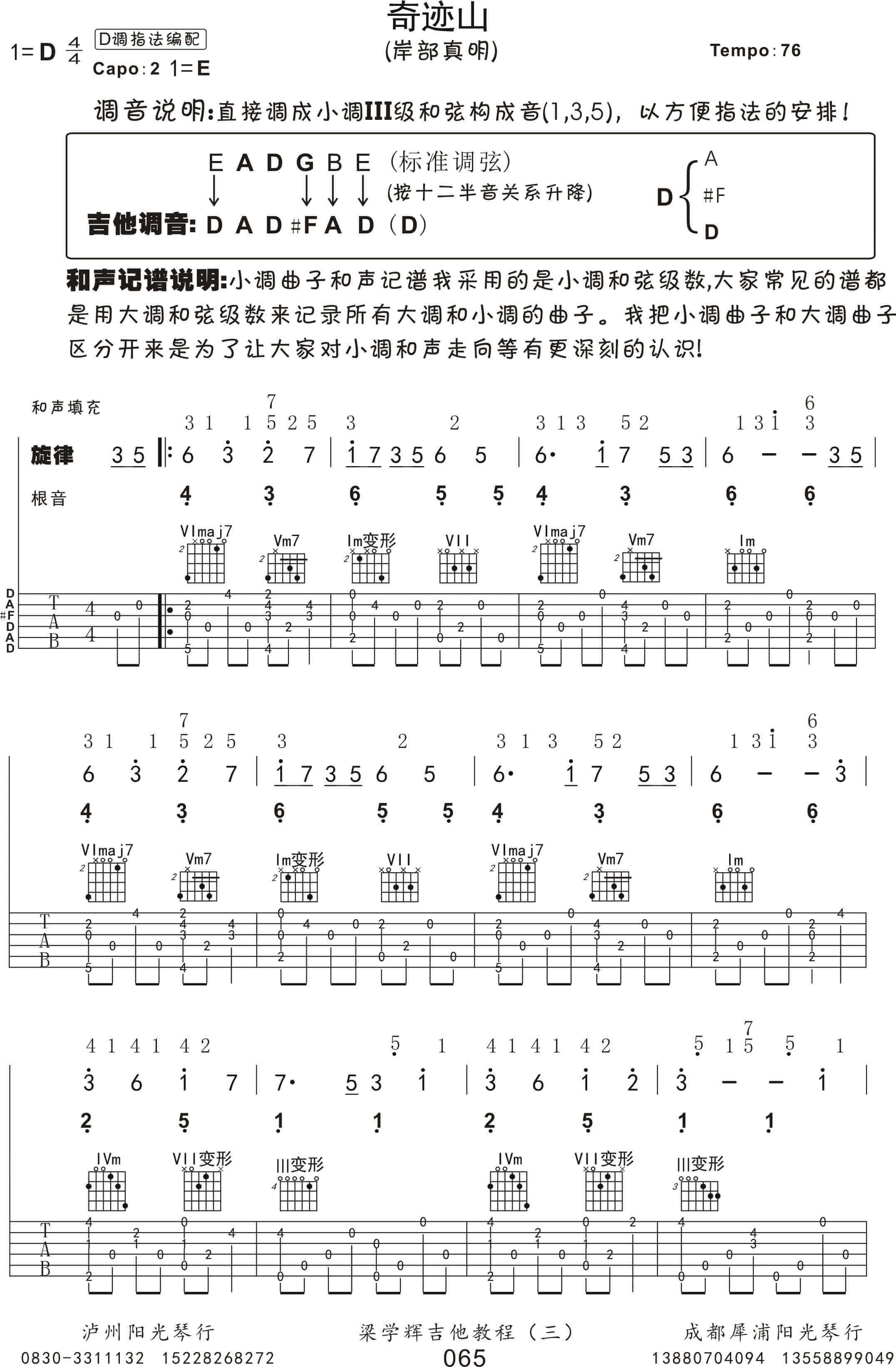 曲谱介绍: 奇迹的山吉他谱指弹 D调这个旋律很清新,旋律行云流水一般,在静谧的山林之中,听着树叶沙沙作响,听泉水叮咚,在午后,一个人眺望远方的山,思绪万千,那么多诗人,文艺工作者以山为背景不无道理。在山林之中,是一片净土,我们可以抛弃烦恼,静静地聆听这个曲调,这旋律每一个音符似乎都能勾起一段回忆,或是一个心里的故事,又或者是一个美好的回忆。