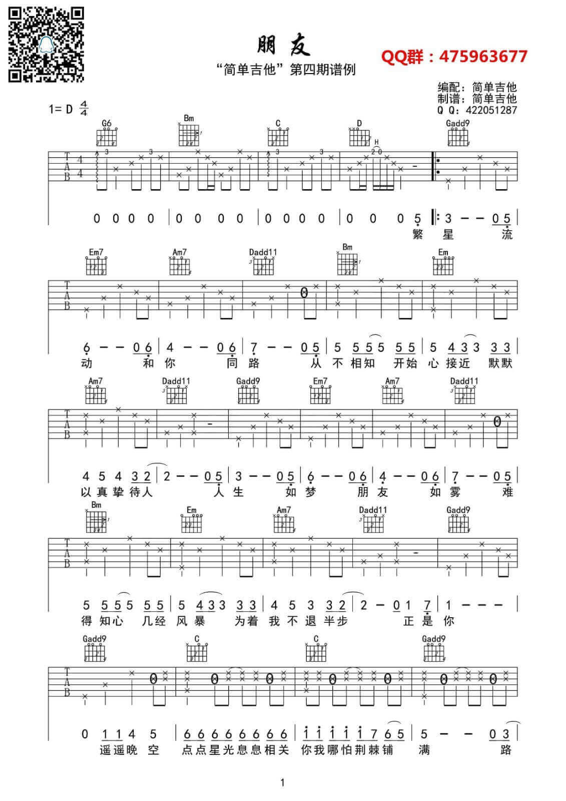 曲谱介绍: 朋友吉他谱采用了D调指法,由简单吉他编配完成。