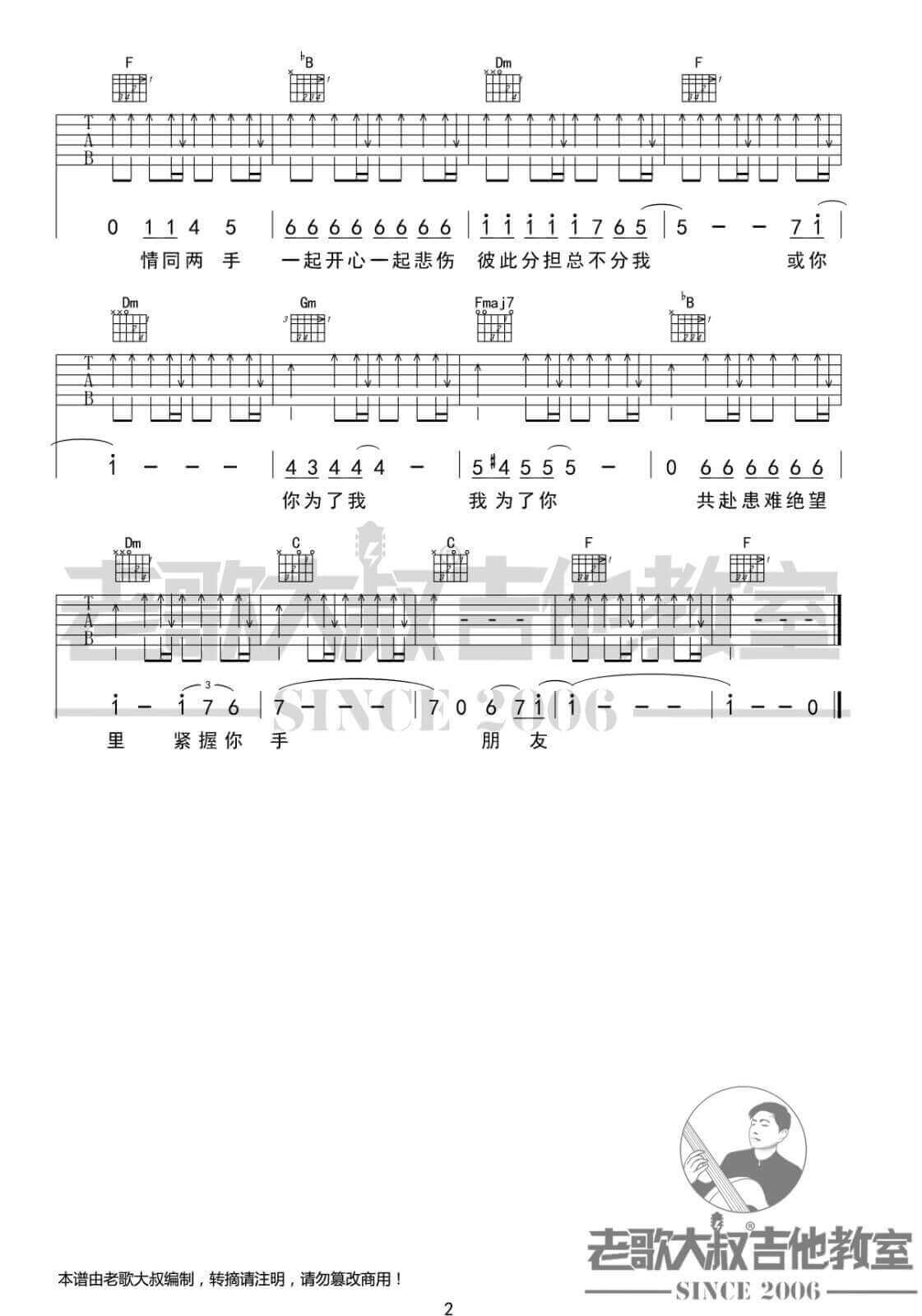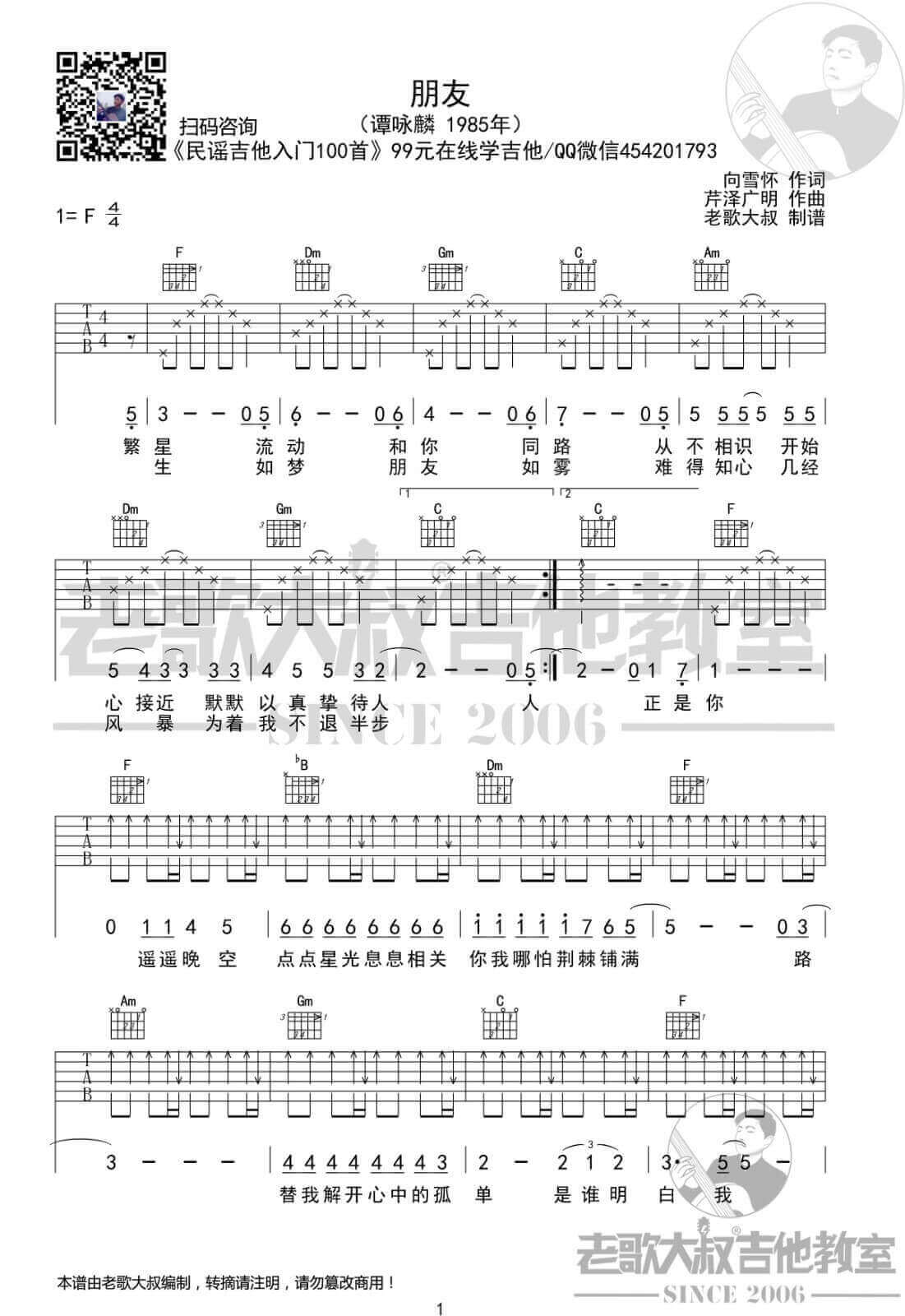曲谱介绍: 朋友吉他谱采用了F调指法,由老歌大叔吉他教室编配完成。