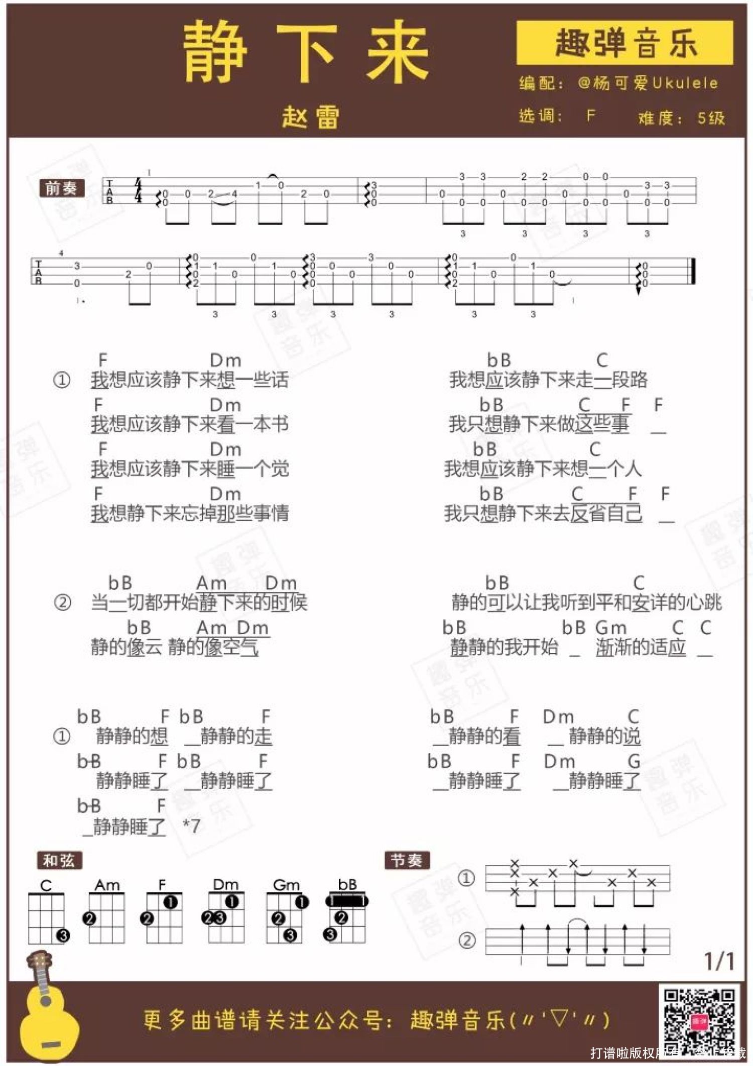 曲谱介绍: 一首打动无数人的《成都》让大家认识了歌手赵雷,也让更多人开始关注民谣。 11月8日,赵雷的新歌《静下来》发布,三小时后,网易云音乐评论超过一万。 “不怕好评亦批评,只怕内心不宁静。”音乐给赵雷带来了热度和关注,但他想同样通过音乐找回最初沉静的心。 在这初冬的夜里,戴上耳机享受雷子带来的暖心音乐,一起品读安静的力量。   民谣与赵雷 “静下来品味,你会发现赵雷的代表作不止是《成都》。” 雷子一直是一个用音乐表达内心的人,似乎看到他的时候,他总是和吉他或是话筒在一起。 他沉默寡言,但他的每一首作品都能替无数人说出很多心底的话。不做作,不矫情,又接地气,是他音乐的一大特点。 民谣更多时候是需要静下来听的。车水马龙无处不喧嚣,只有自己的内心平静了,周遭世界才会安静。   弹唱曲谱