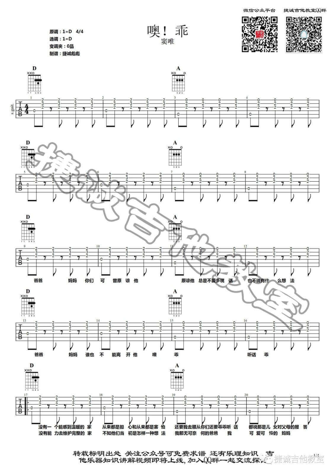 曲谱介绍: 噢!乖吉他谱采用了D调指法,由鹤唳吉他教室编配完成。这一首歌是窦唯自己作词作曲自己演唱的歌曲,他的歌有自己的特色,有自己的风格,多变的声音让人琢磨不透,他的旋律很有节奏感,他的演绎也很特别,他的歌词直白易懂,这或许是他内心的独白,孤独无奈,让人心疼。他在认真地做音乐,热爱音乐,他的歌曲能够直击心灵的原因就在于,他能够毫无保留地向听众传递他的情绪,很真实。