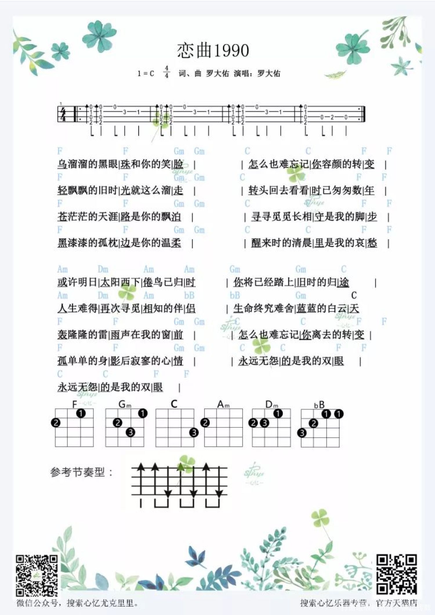 曲谱介绍: 《恋曲1990》大家再熟悉不过,发行于1988年,虽然那时候很多小伙伴还没出生,却在爸妈的熏陶下,这首歌成了罗大佑的经典。 不过今天想推荐的是新疆独立音乐人孟大宝的版本,干净的嗓音以及温柔的和弦,会让人有种暖暖的幸福感~感觉像回到了童年   《恋曲1990》尤克里里谱
