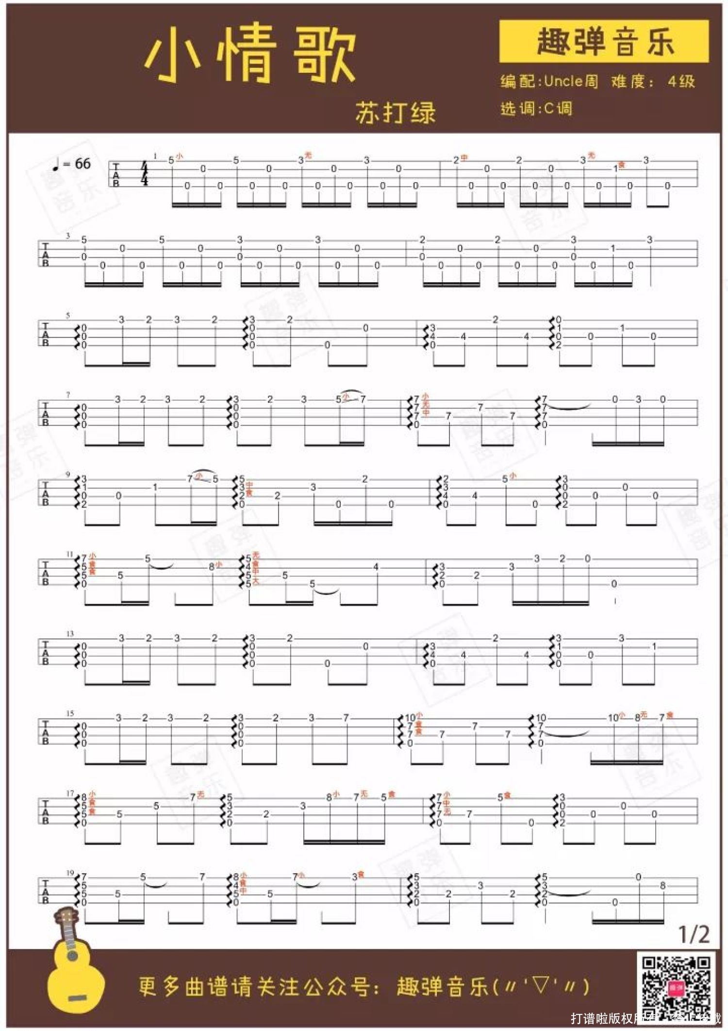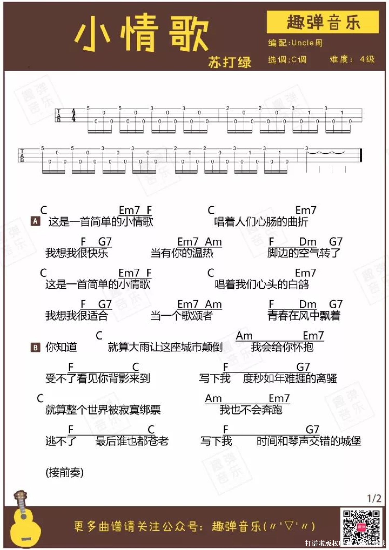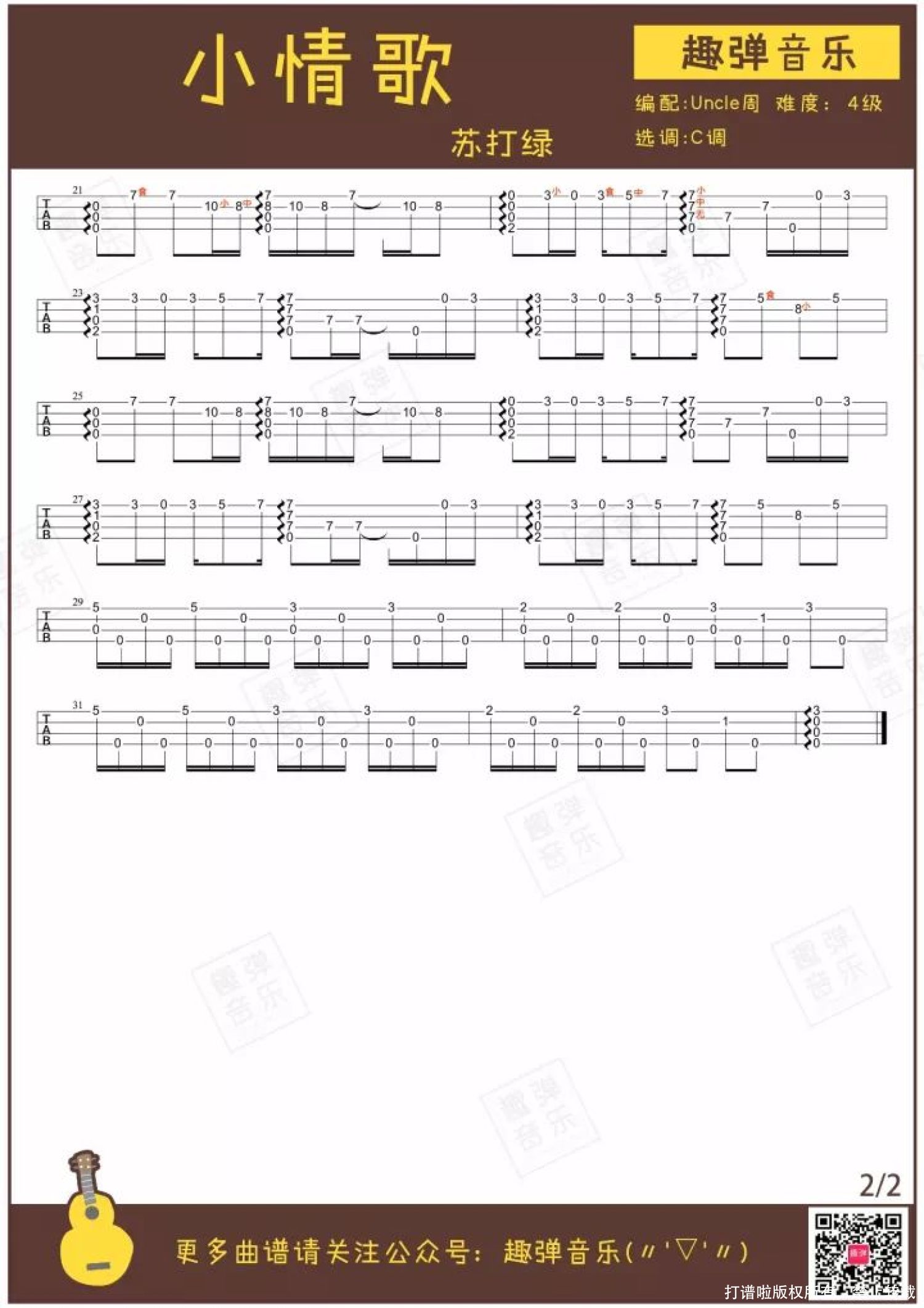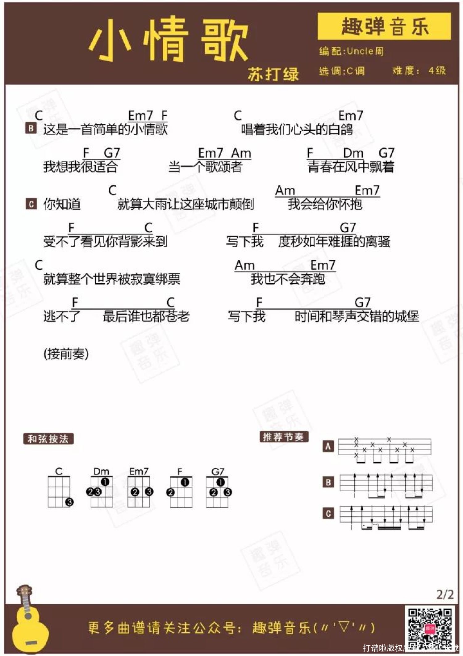 曲谱介绍: <小情歌>清新简单的旋律,用小U弹奏再适合不过啦~   这首指弹有没有从前奏开始就一下子抓住了你的心? 不用多余的修饰,无需复杂的技巧,最简单的旋律就如此清新动听,简直和小U清澈明亮的音色完美契合~   这段旋律来自苏打绿的《小情歌》,如歌名一样,是一首甜蜜又温柔的歌曲。 小U流水叮咚一般的音色与这首歌的旋律搭配,让人感觉像被阳光洒满一般充满了幸福与温暖,又很好地还原了歌曲清新简单的特点。 一起和Uncle周弹奏这首简单动听的清新小情歌吧♪ 小情歌-Ukulele指弹   关于歌曲   ● 由吴青峰作词作曲,苏打绿演唱的一首歌曲,出自专辑《小宇宙》。 ● 在第18届台湾金曲奖颁奖礼中,获得最佳作曲奖。 2007年,《小情歌》让苏打绿第一次进入大众视野,一时间几乎所有人都会在嘴边哼着这段简单的旋律。 创作并作为这首歌主唱的吴青峰说:“这是一首幸福的歌,形容恋人难分难舍,不愿看到对方转身的背影的种种感受。不知道为何大家都把这首歌看作悲伤的歌,其实一点都不难过。” 小情歌给人的第一感觉的确是甜美纯真的恋情,但听多了又会觉得淡淡的哀伤,这甜蜜与忧伤的交织也就是《小情歌》所要表达的主题。   指弹曲谱   附:弹唱曲谱