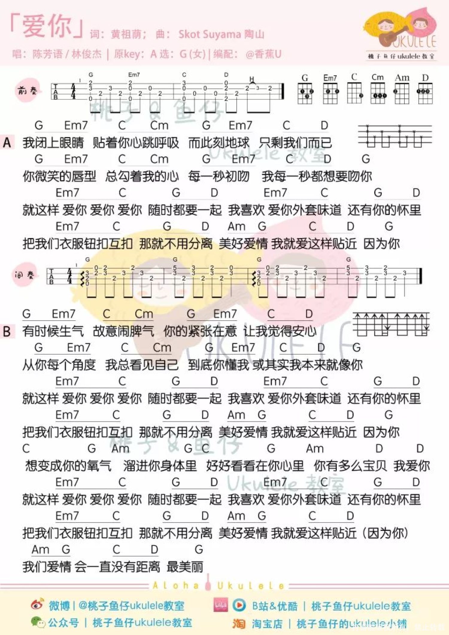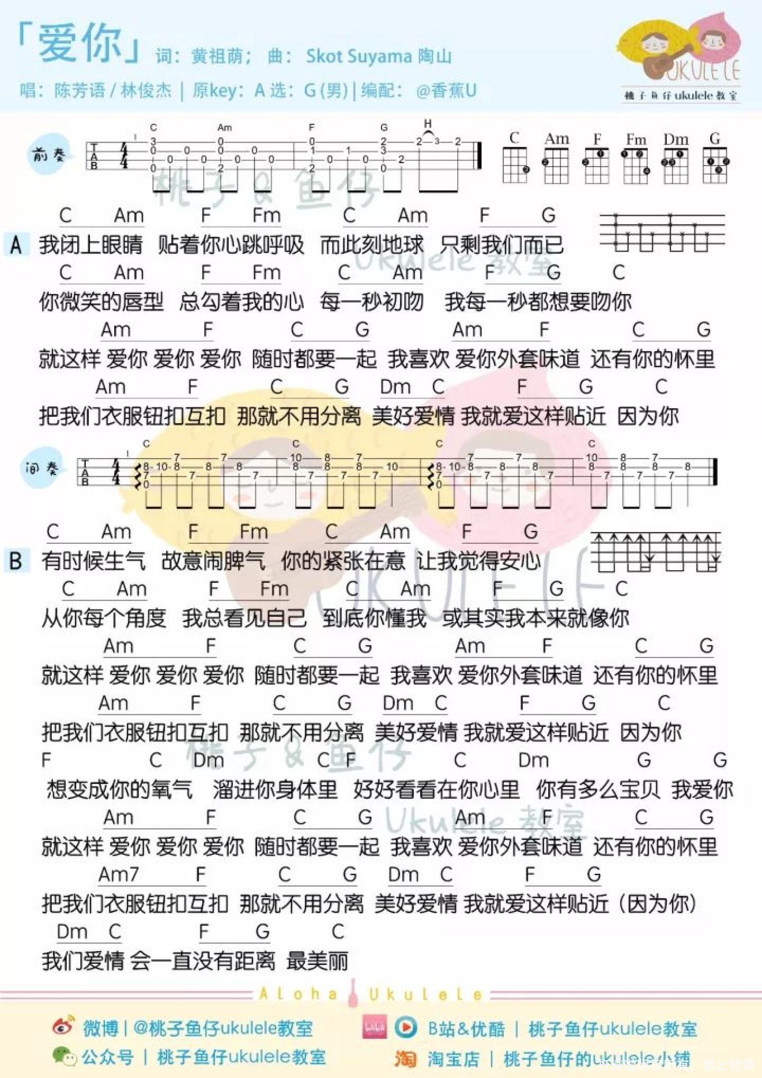 曲谱介绍:   陈芳语甜美的嗓音 让这首歌成为受欢迎的婚礼歌曲 ● 继《至少还有你》(谱:「至少还有你」• 林忆莲 | 尤克里里弹唱谱)之后,林俊杰在《梦想的声音》,再度翻唱情歌。这一次,林俊杰翻唱了陈芳语的告白金曲《爱你》。 ● JJ的改编自然让人无比期待,而要打破歌迷先入为主的壁垒也是一项极大的挑战,但他就是林俊杰,一项艰巨的挑战就这样在他的麦中化为了浪漫深情的优美旋律。 ● 虽没有大幅度改编,林俊杰用自己的方式,诠释了爱情的美好和浪漫。就是这么简单,反而最撩人心弦。不少听众,直呼听完回到初恋般怦然心动的感觉。 ● 《爱你》是一首充满少女心的音乐作品,简单的旋律在一定程度上限制了改编甚至发挥。此外,直白的歌词如何以男生的角度去诠释则又是另一大挑战。不过这些都没有难住林俊杰,他没有继续使用大气磅礴的演唱方式,而是仅仅挑选了一把吉他来做伴奏,更多的是依靠自己扎实的唱功来演绎这首歌曲,以男生的口吻告诉大家面对喜欢的女生该如何告白。面对JJ如此精彩的表演,大家都纷纷为他打call!实际上,林俊杰曾多次翻唱过女歌手的作品并备受好评。   尤克里里弹唱cover 一起感受歌曲的甜蜜吧~   尤克里里弹唱教学   爱你尤克里里谱