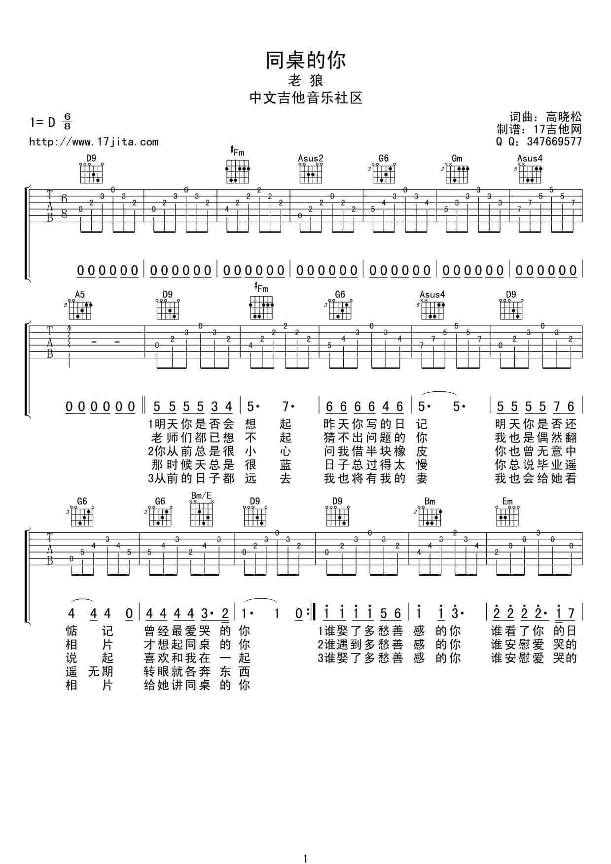 曲谱介绍: 同桌的你吉他谱采用了D调指法,由17吉他编配完成。