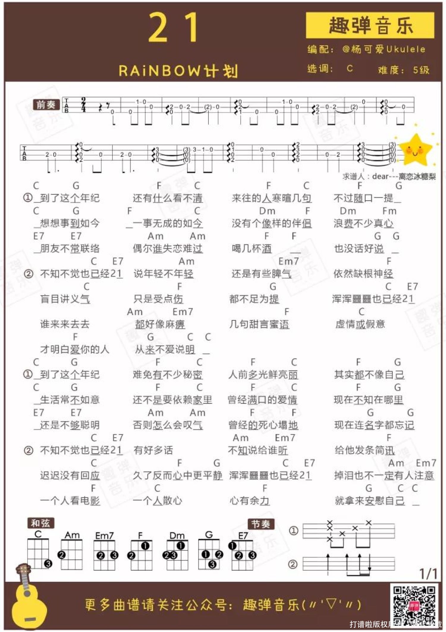 曲谱介绍: 21   ● 由刘雨含作词作曲的一首原创歌曲。 ● 由一支名为RAiNBOW计划的90后乐队演唱。 RAiNBOW计划,90后原创音乐团队。 计划在十年或更长时间内,陆续出齐彩虹七色加黑、白、透明--共计10张主题音乐原创专辑,做出能陪伴一代年轻人成长的好音乐。 《21》这首歌唱出了在二十出头的年纪的人的迷茫与不安。   弹唱曲谱