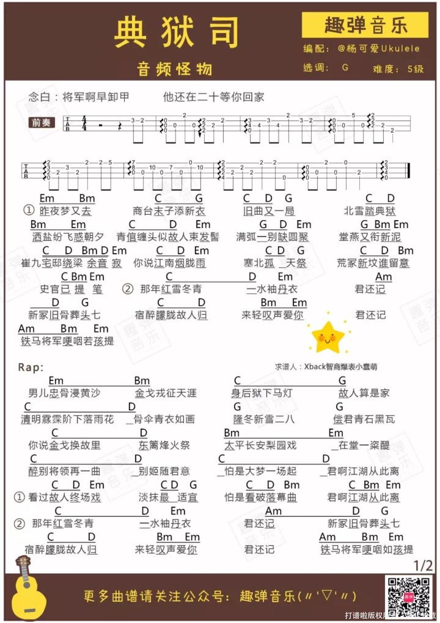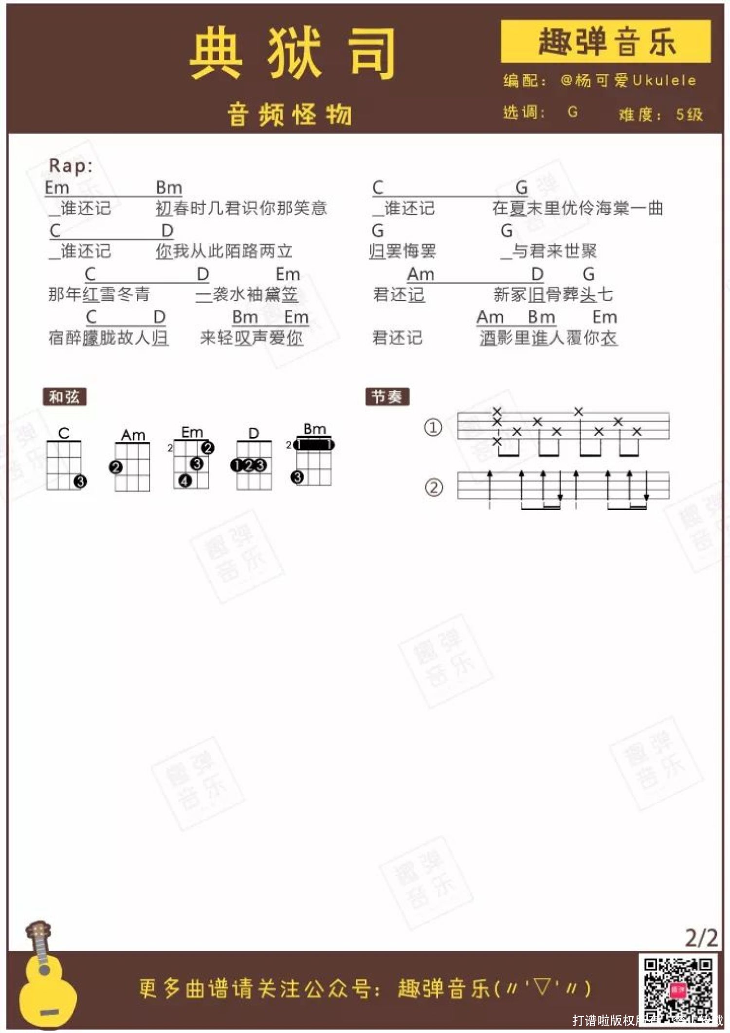 曲谱介绍: 典狱司   ● 是一首小说同人衍生的歌曲,并作为电视剧《老九门》片尾曲。 ● 由江淮沿岸填词,由和汇慧编曲,由音频怪物演唱。 电视剧《老九门》是南派三叔同名小说改编的,是一部民国悬疑电视剧,《典狱司》是它的片尾曲。 演唱这首歌曲的音频怪物,是一位配音演员、广播剧演员。早期歌曲以填词翻唱为主,现有大量原创作品。他在这首歌曲中的一段戏腔令人惊艳。   弹唱曲谱