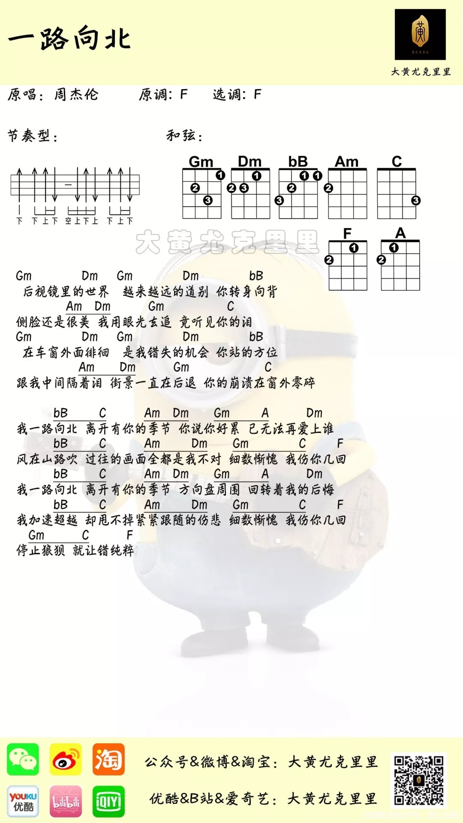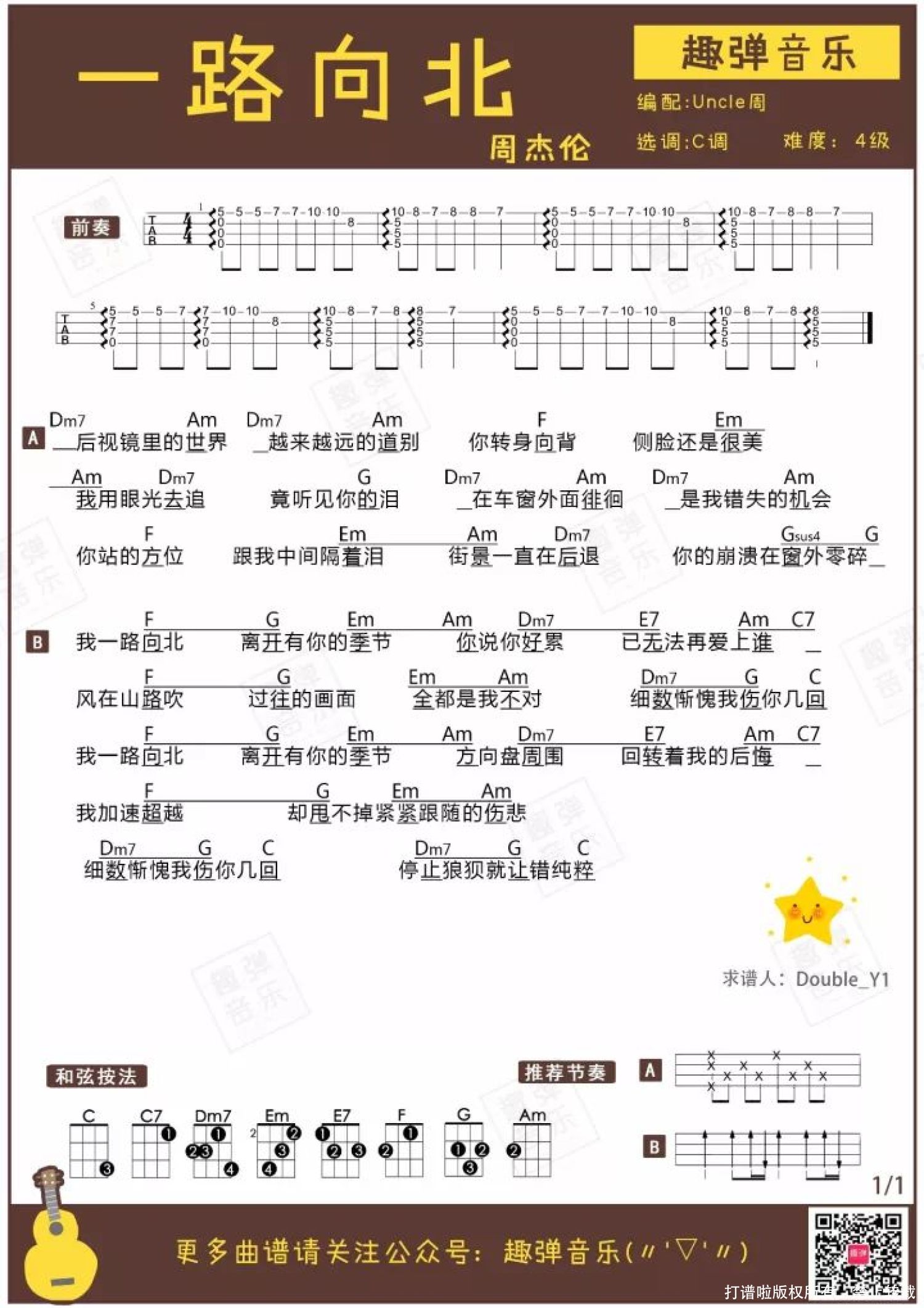 曲谱介绍: Aloha!我是兢兢业业的制谱机。我们又收获四首好谱,经典老歌和新歌都有哦! 四首歌风格各不相同,都非常好听,赶紧来收谱吧♪   一路向北 ● 由方文山作词,周杰伦作曲并演唱,收录于专辑《十一月的萧邦》中。 ● 是周杰伦为电影《头文字D》专门创作的插曲。   《一路向北》是一首英式抒情摇滚歌曲。前奏带有唯美的基调,整首歌哀伤淡淡变化不多。听到这首歌,就会想起电影《头文字D》中杰伦边开车边流泪的场景。   一路向北C调 弹唱曲谱   一路向北尤克里里谱 F调