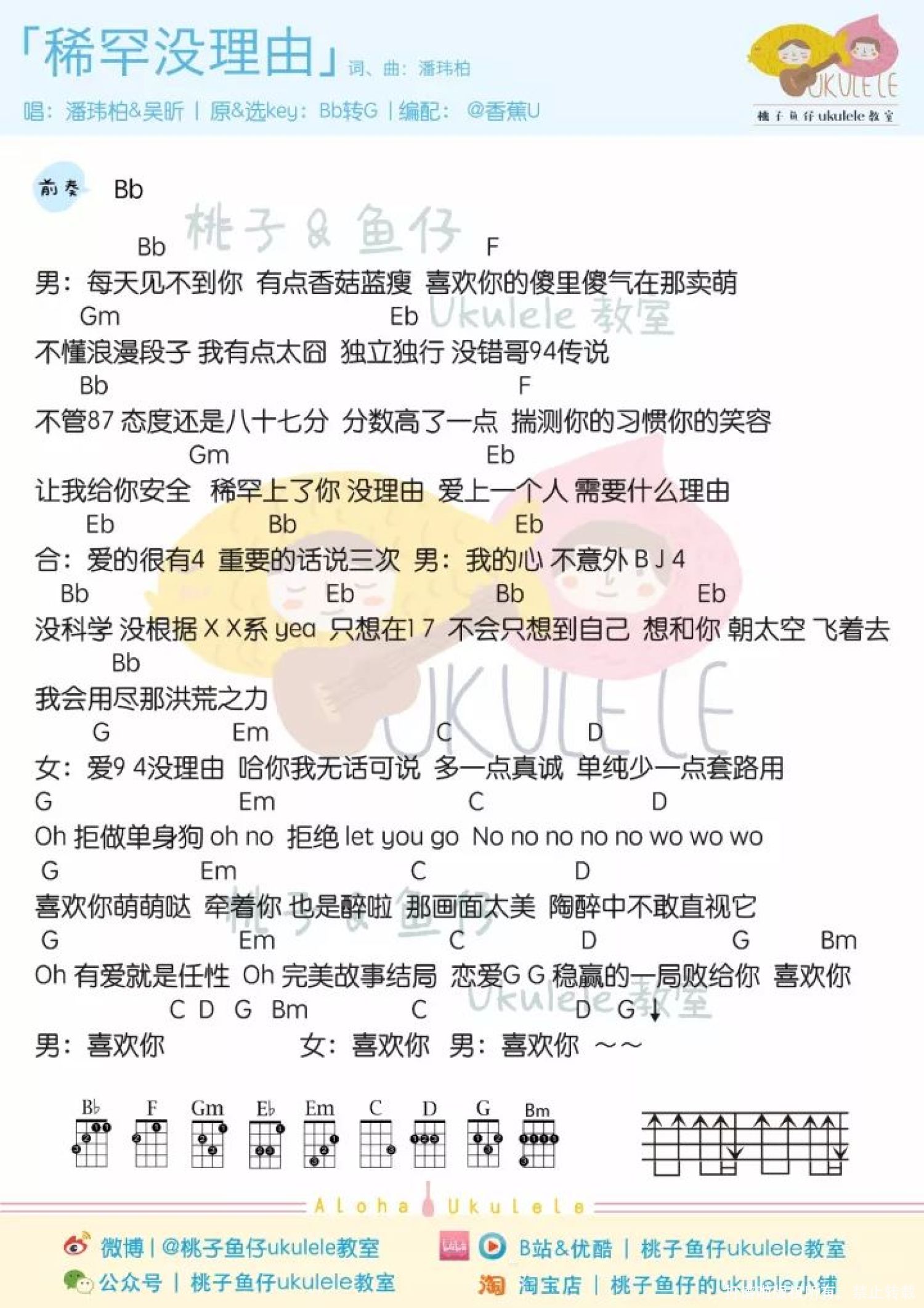 曲谱介绍: 在节目《我们相爱吧》中潘玮柏和吴昕共同在录音棚完成了一首歌的录制,那就是由潘玮柏自己作词作曲的《稀罕没理由》~ 无尾熊CP合唱~   《稀罕没理由》尤克里里谱