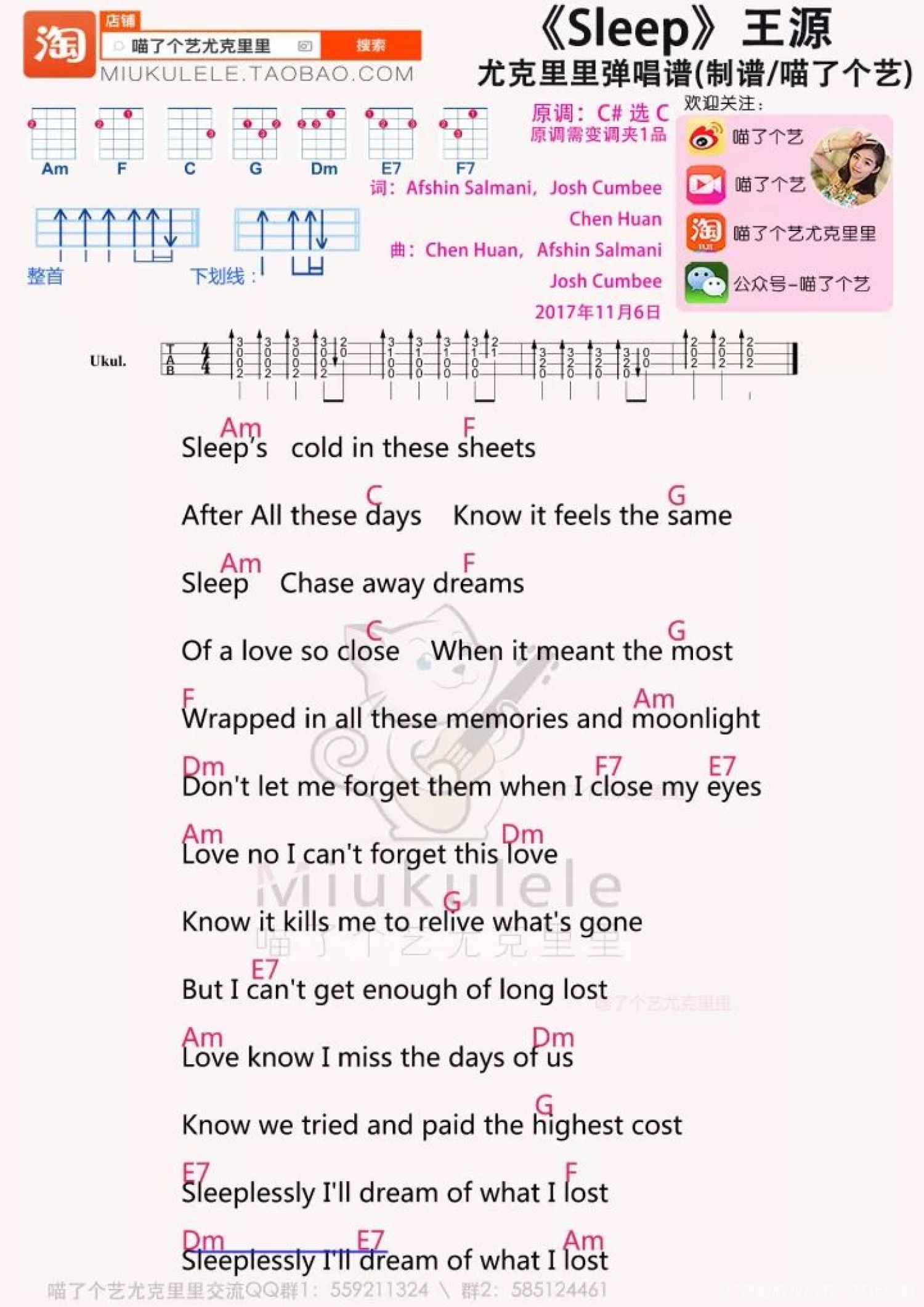 曲谱介绍: 王源首支英文单曲《Sleep》,适合送给刷朋友圈的你,好听哦。   [强烈推介]   《SLEEP》尤克里里弹唱谱