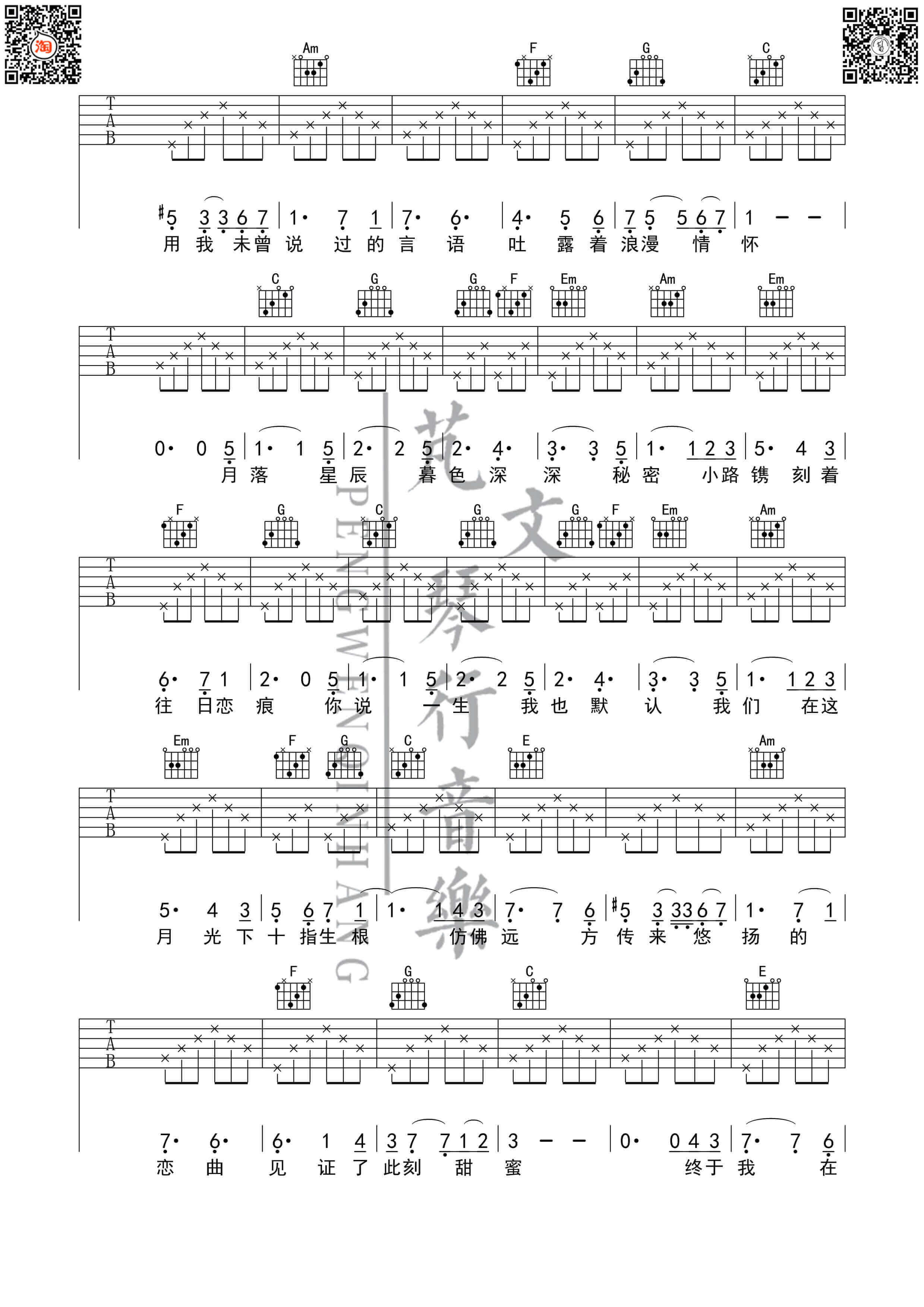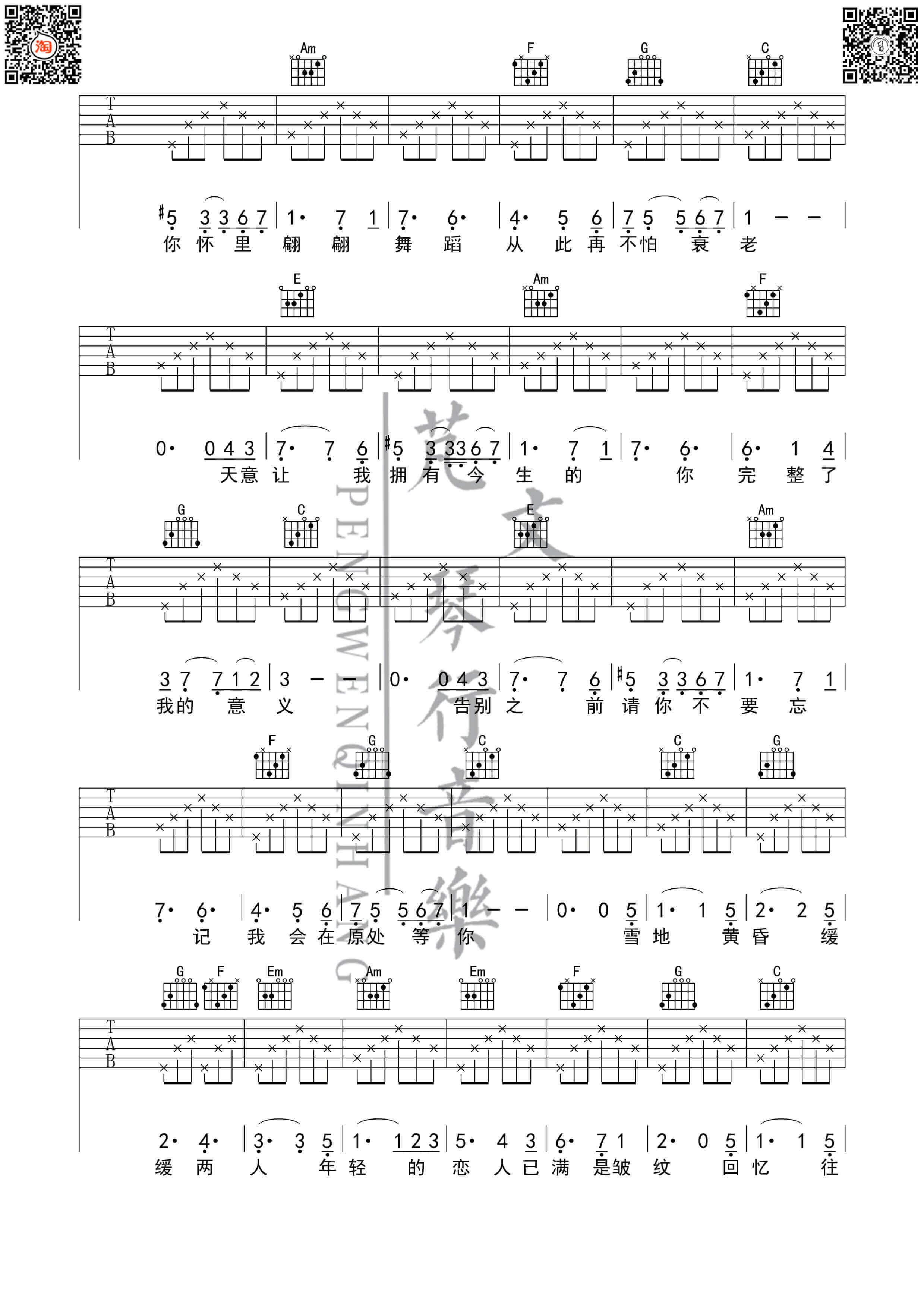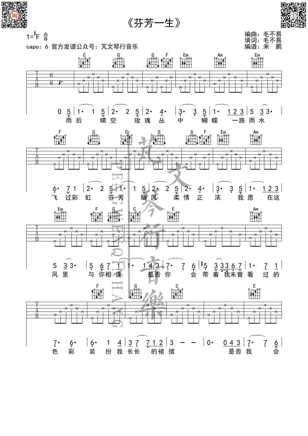 曲谱介绍: 芬芳一生吉他谱采用F调指法,由芃文音乐编配。