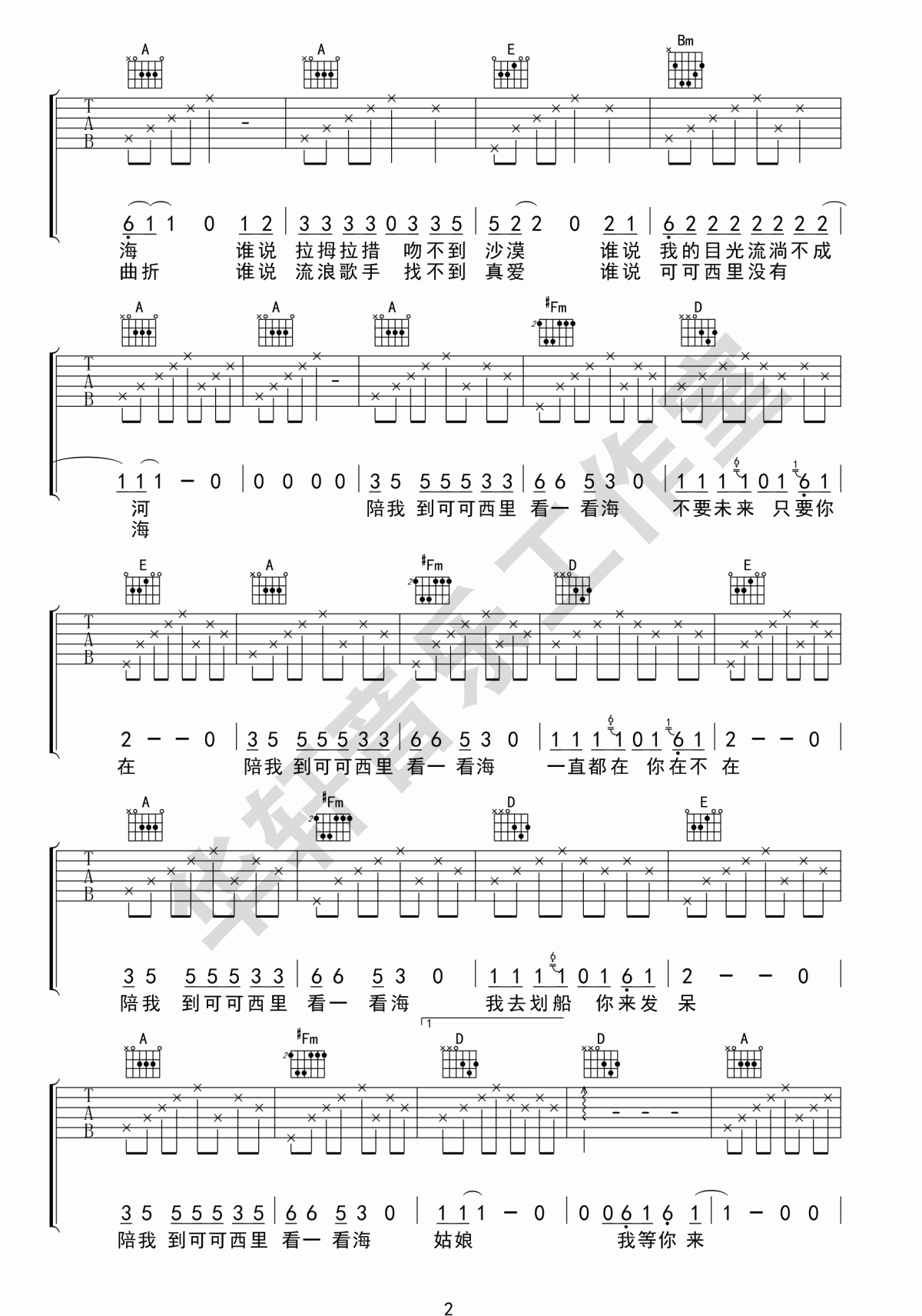 陪我到可可西里去看海吉他谱 - 大冰 - A调吉他弹唱谱