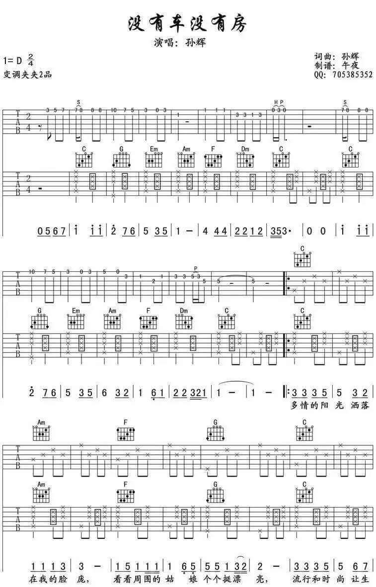 曲谱介绍: 没有车没有房吉他谱采用了D调指法,由午夜编配完成。