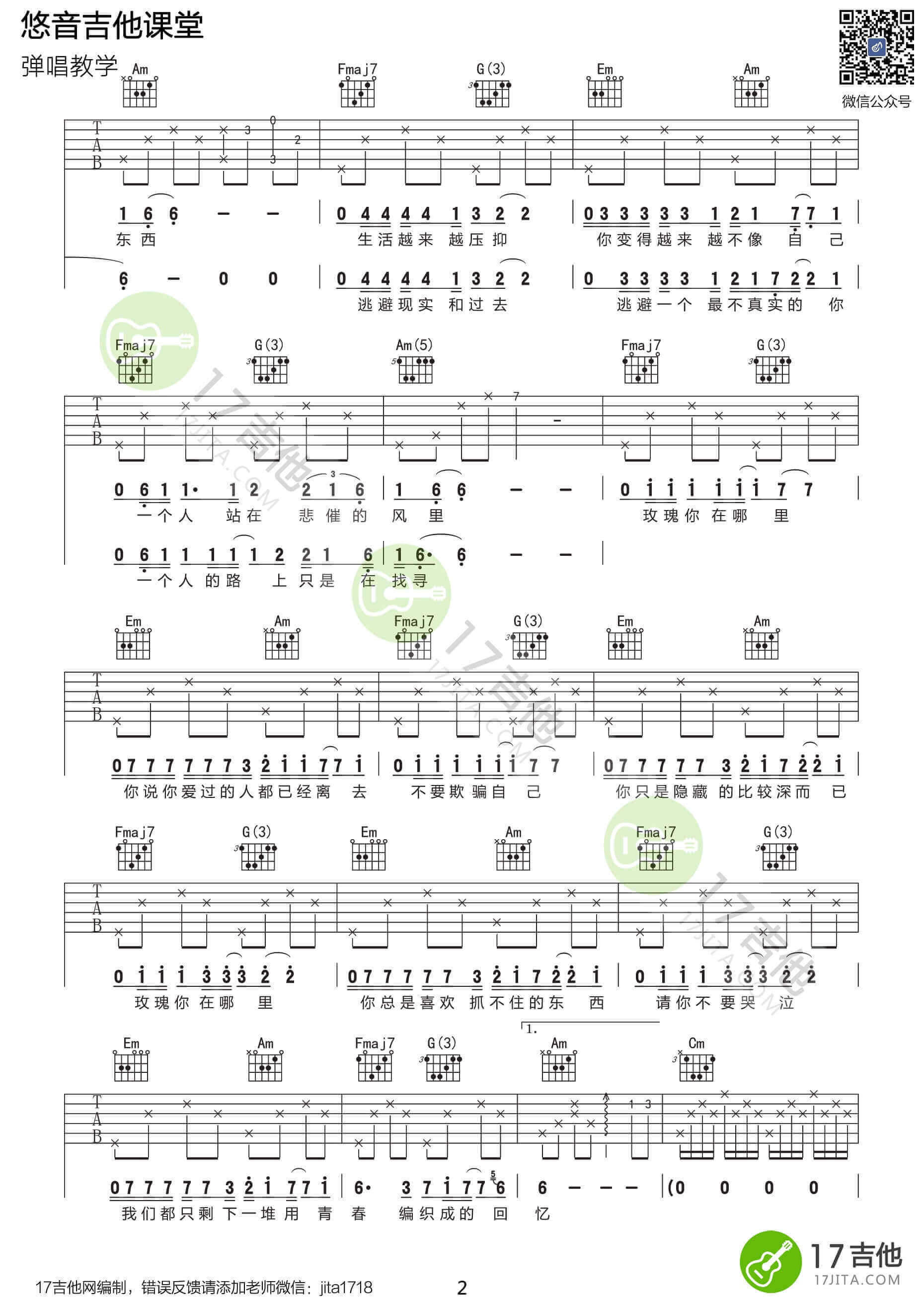 曲谱介绍: 玫瑰吉他谱采用了C调指法,由悠音课堂编配完成。直到现在,还是会经常觉得自己就是多余的一个人。活着也没有什么益处,只是不敢死,所以也就这么活着了。