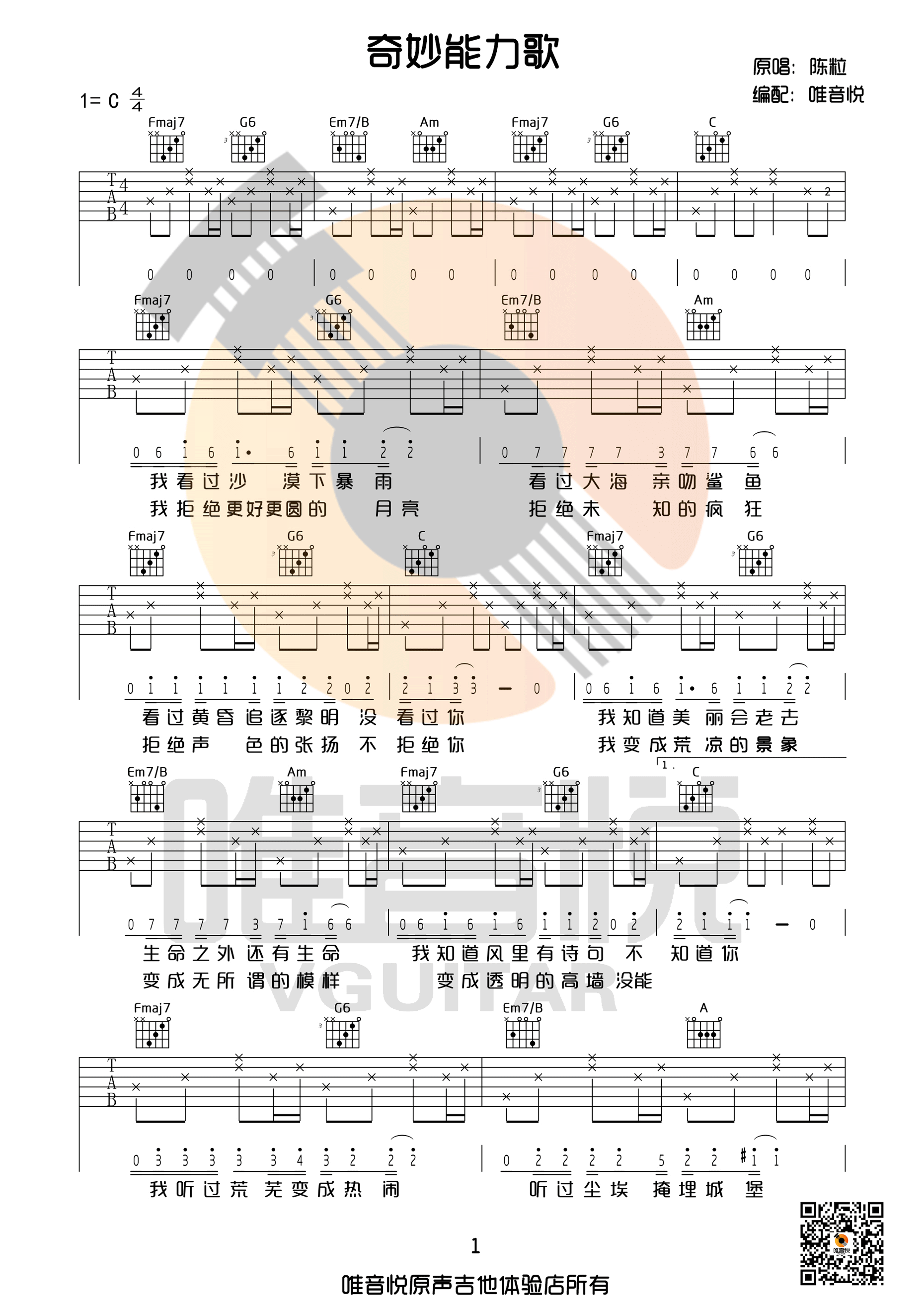 曲谱介绍: 奇妙能力歌吉他谱采用了C调指法,由唯音悦编配完成。这首歌曲受到了很多人的支持和喜爱,在这首歌曲之中,有魔力的歌词,搭配上陈粒魔幻的嗓音,让我们心动不已。另外,和这首一样赞的生之响往吉他谱也非常NICE,大家快去学习吧!