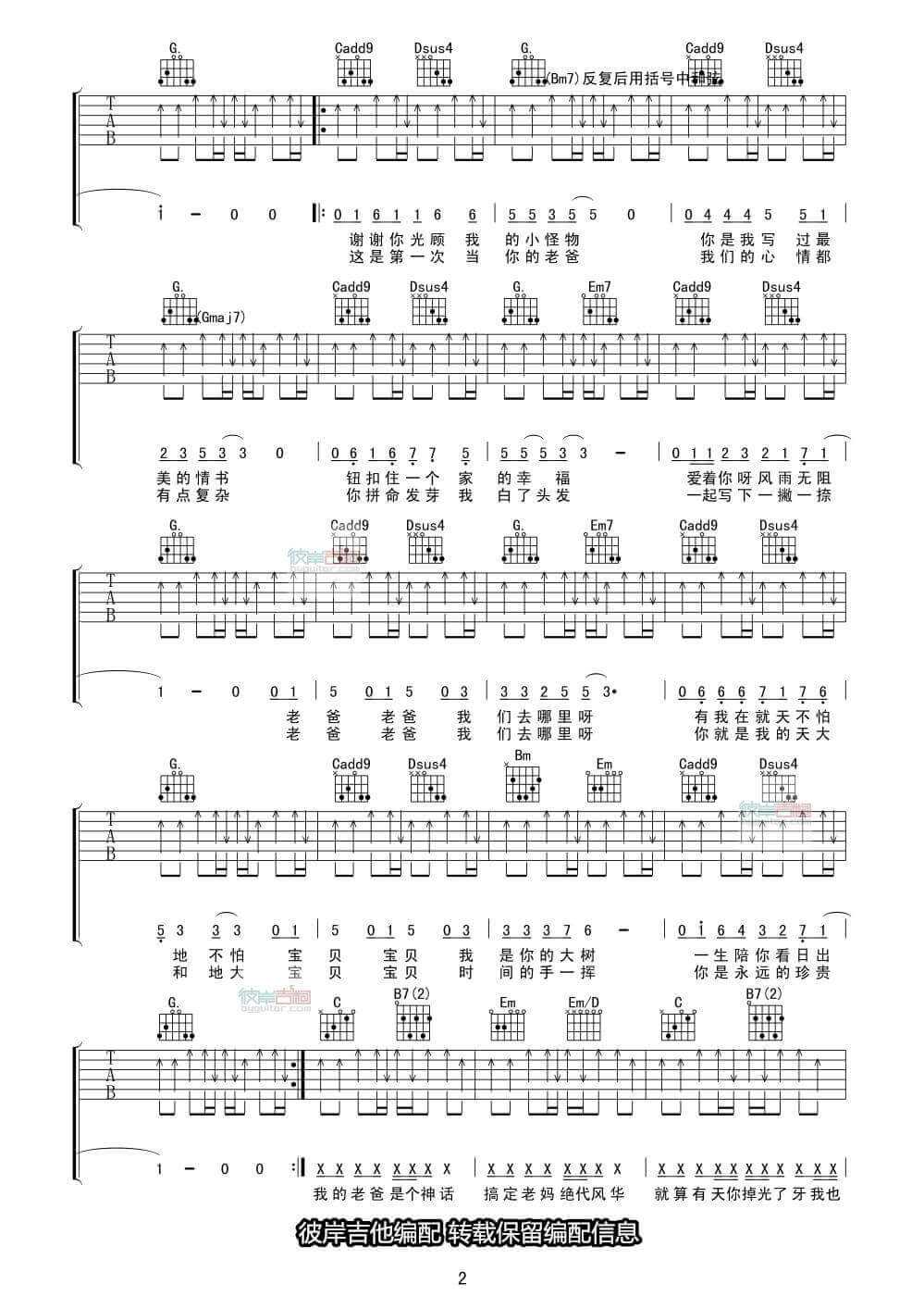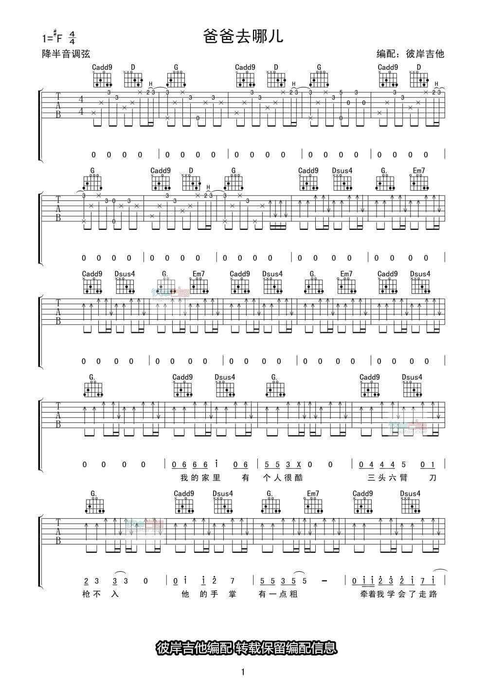 曲谱介绍: 爸爸去哪儿吉他谱采用了F调指法,由彼岸吉他编配完成。听兄弟说,美丽新世界吉他谱听了耳朵会怀孕,快快学起来,学完去撩妹!