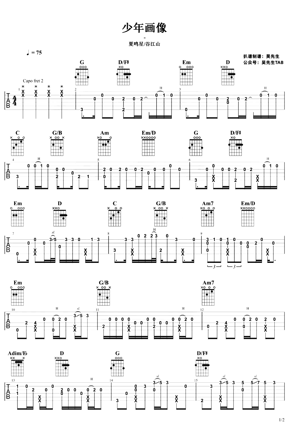 曲谱介绍: 少年画像指弹吉他谱,夏鸣星/谷江山演唱《光与夜之恋》剧情曲,《少年画像》吉他独奏谱,capo夹二品,两张图片谱。
