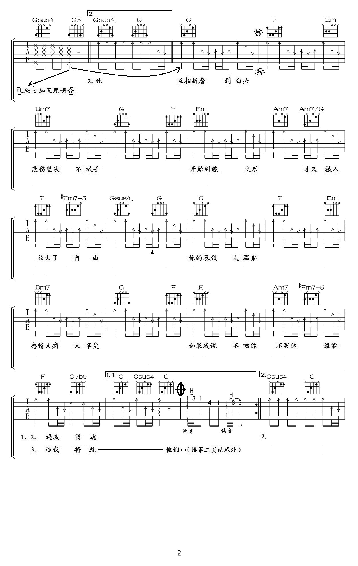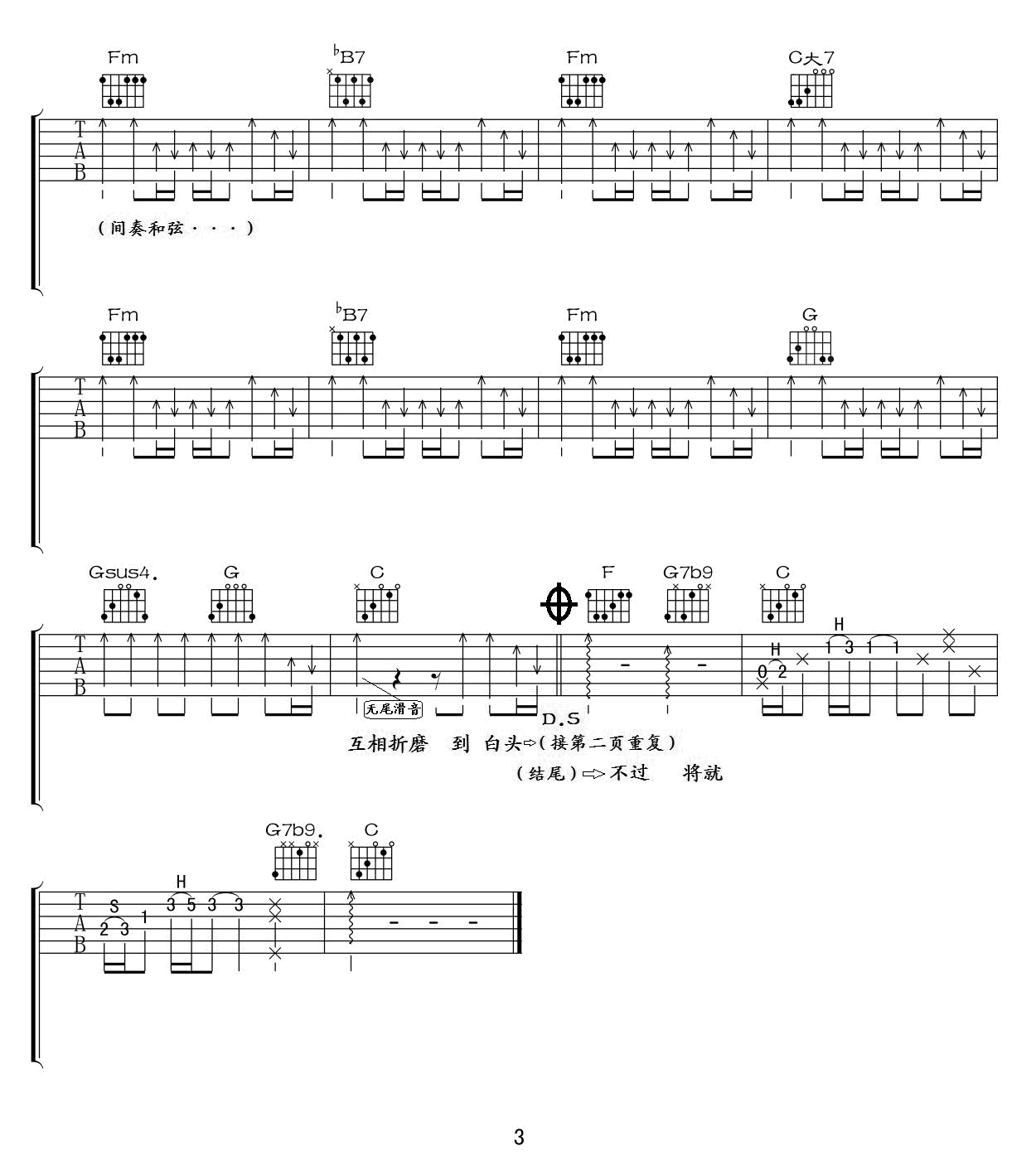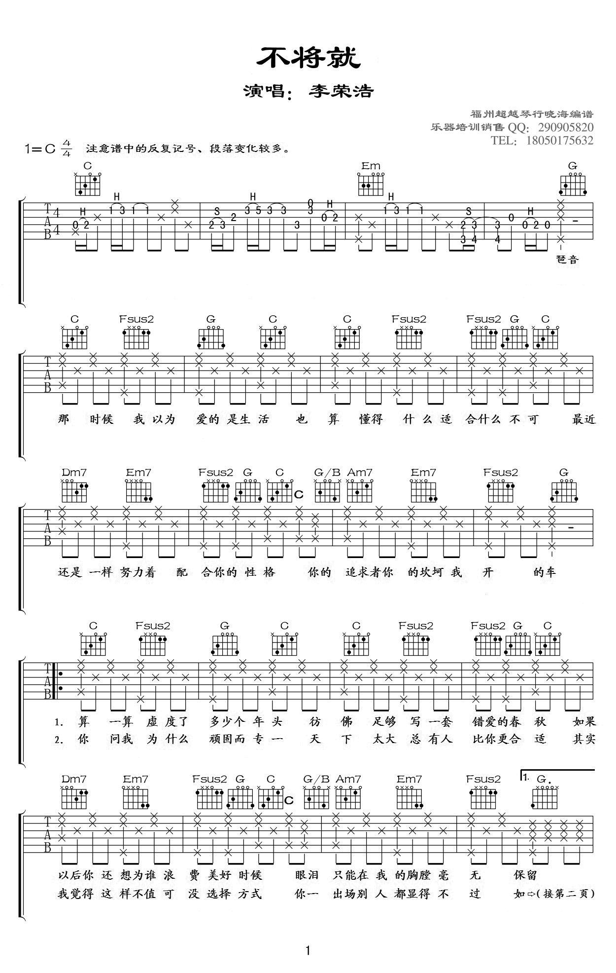 曲谱介绍: 不将就吉他谱,李荣浩为电视剧《何以笙箫默》创作演唱的主题歌。《不将就》吉他弹唱六线谱,选用C调和弦编配,三张高清图片六线谱。演奏的时候,注意曲谱中的反复记号,段落变化较多。