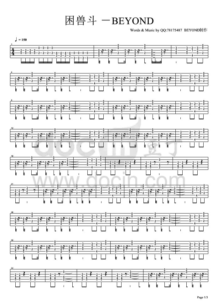 曲谱介绍: 困兽斗吉他谱六线谱,由docin豆丁网做谱。《困兽斗》是中国香港著名摇滚乐队Beyond的一首重金属音乐作品,隐约还有着垃圾摇滚的味道。一段反抗味道强烈的电吉他Riff引领着前半程,音色和力量都非常出色,甚至让人联想起激流金属的玩法。中段变奏后,两把电吉他一粗一细配合默契,随后的电吉他solo相当暴躁,尾段的电吉他尖锐咆哮桀骜不驯,形象的描绘了挣扎和反抗。