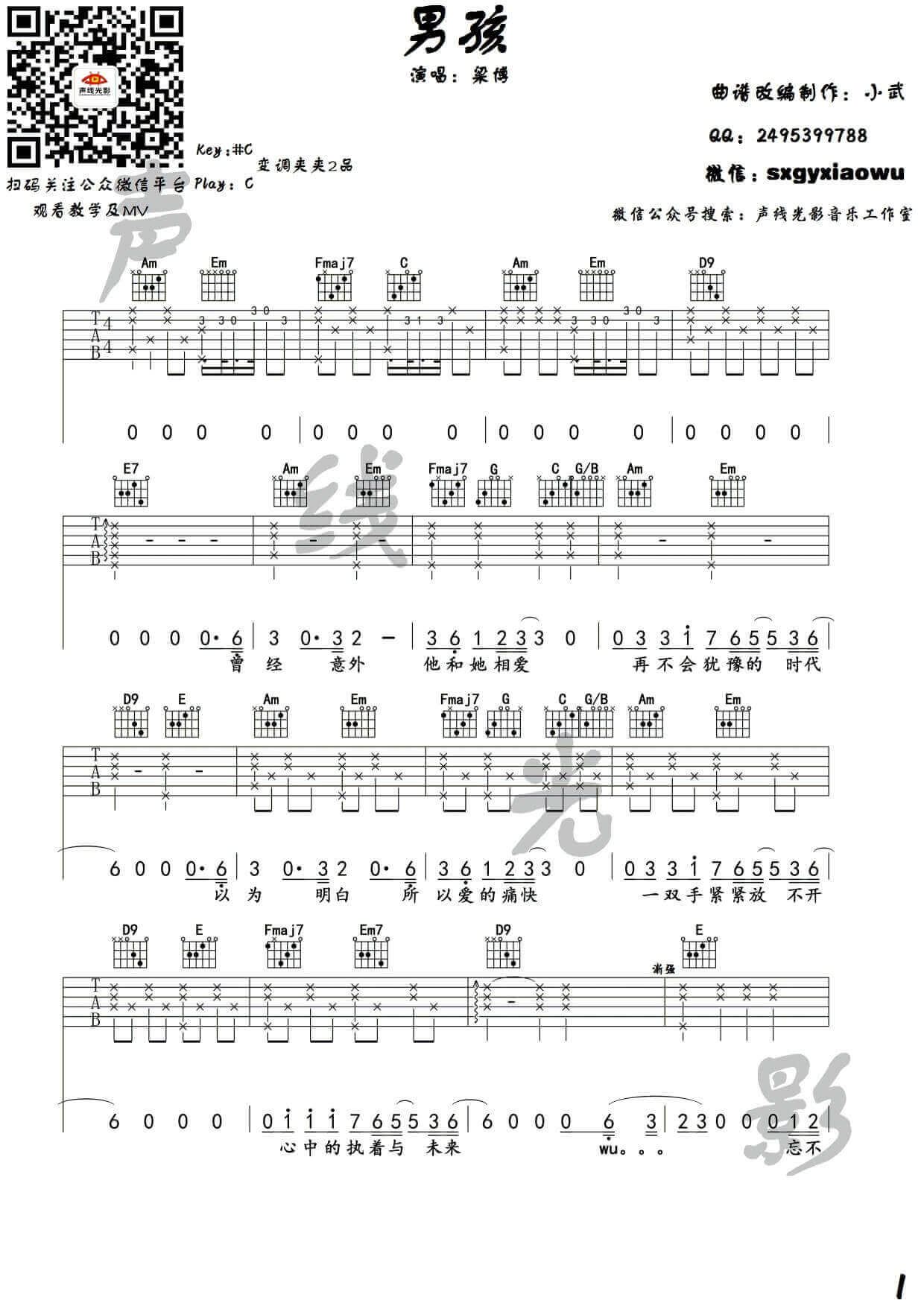 曲谱介绍: 男孩吉他谱采用了C调指法,由声线光影编配完成。 吉他弹唱演示及视频教学