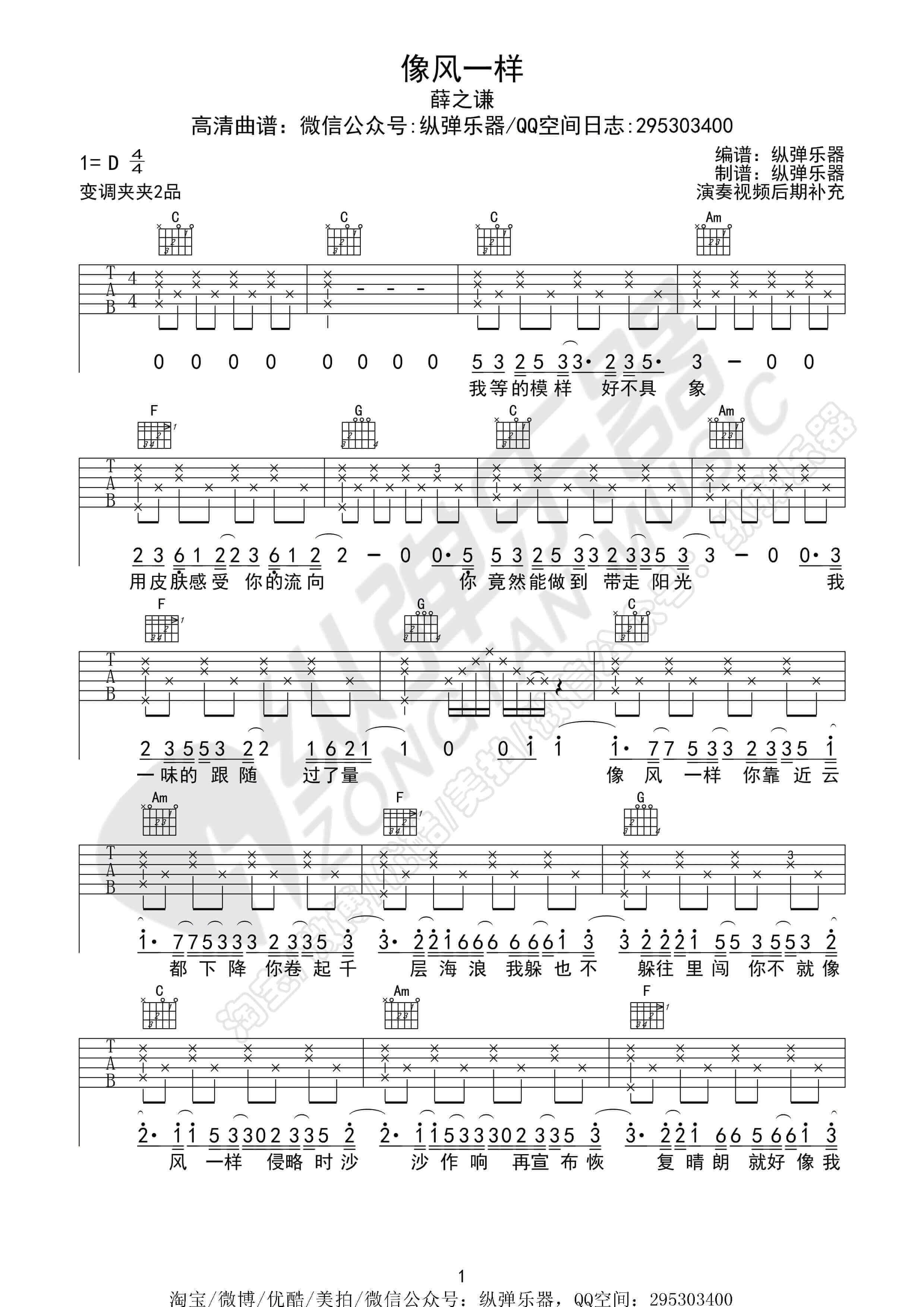 像风一样吉他谱 - 薛之谦 - D调吉他弹唱谱