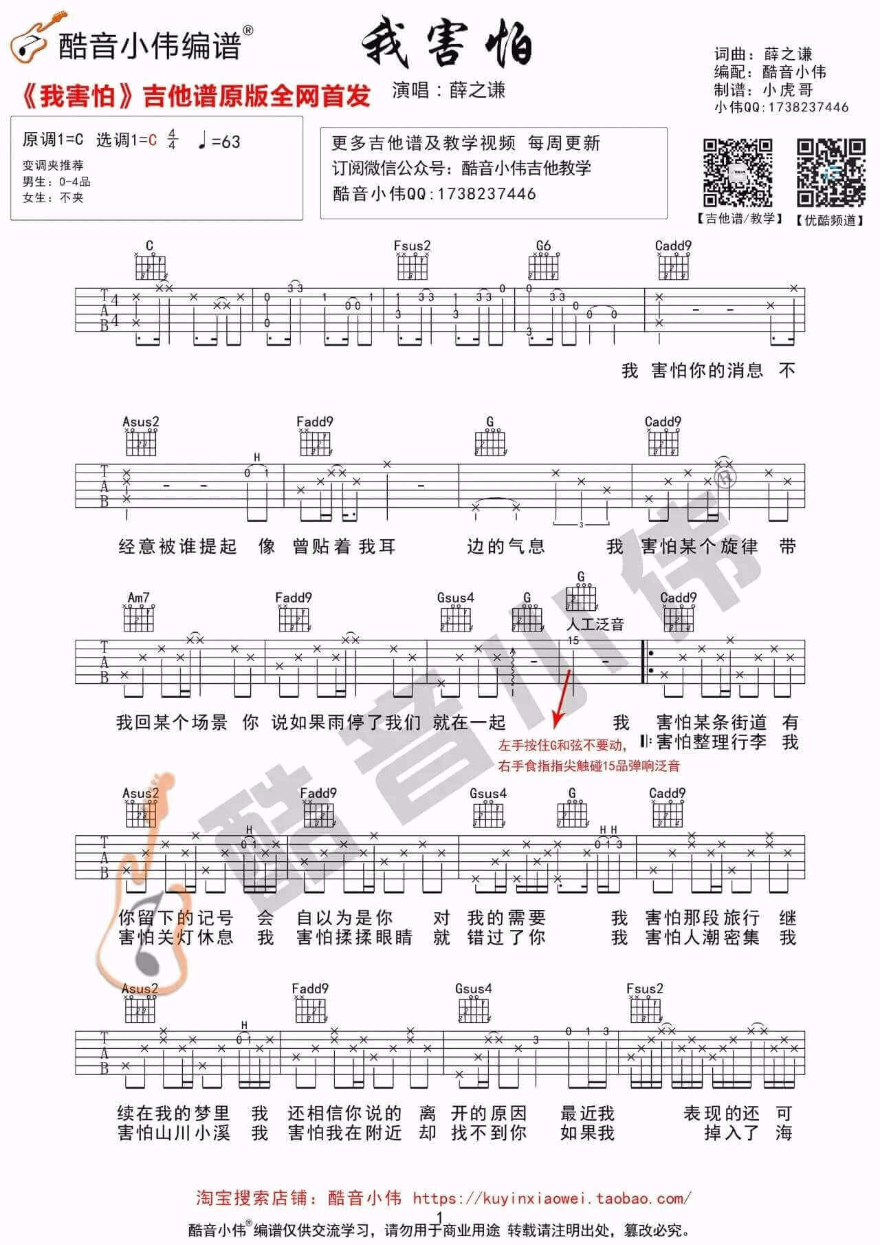 我害怕吉他谱 - 薛之谦 - C调吉他弹唱谱