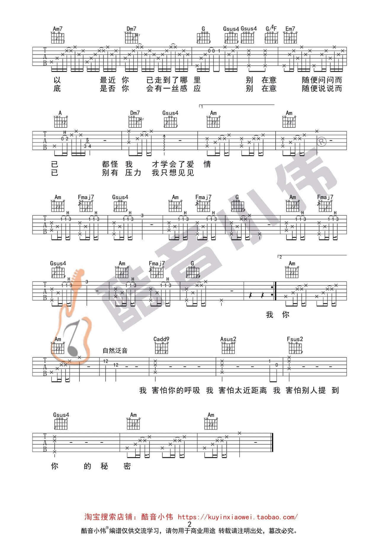 曲谱介绍: 我害怕吉他谱采用了C调指法,由酷音小伟编配完成。整首歌曲曲调都比较低沉平稳,歌词与旋律配合得非常好,将那种孤独感,和害怕感写得非常细腻与贴切。