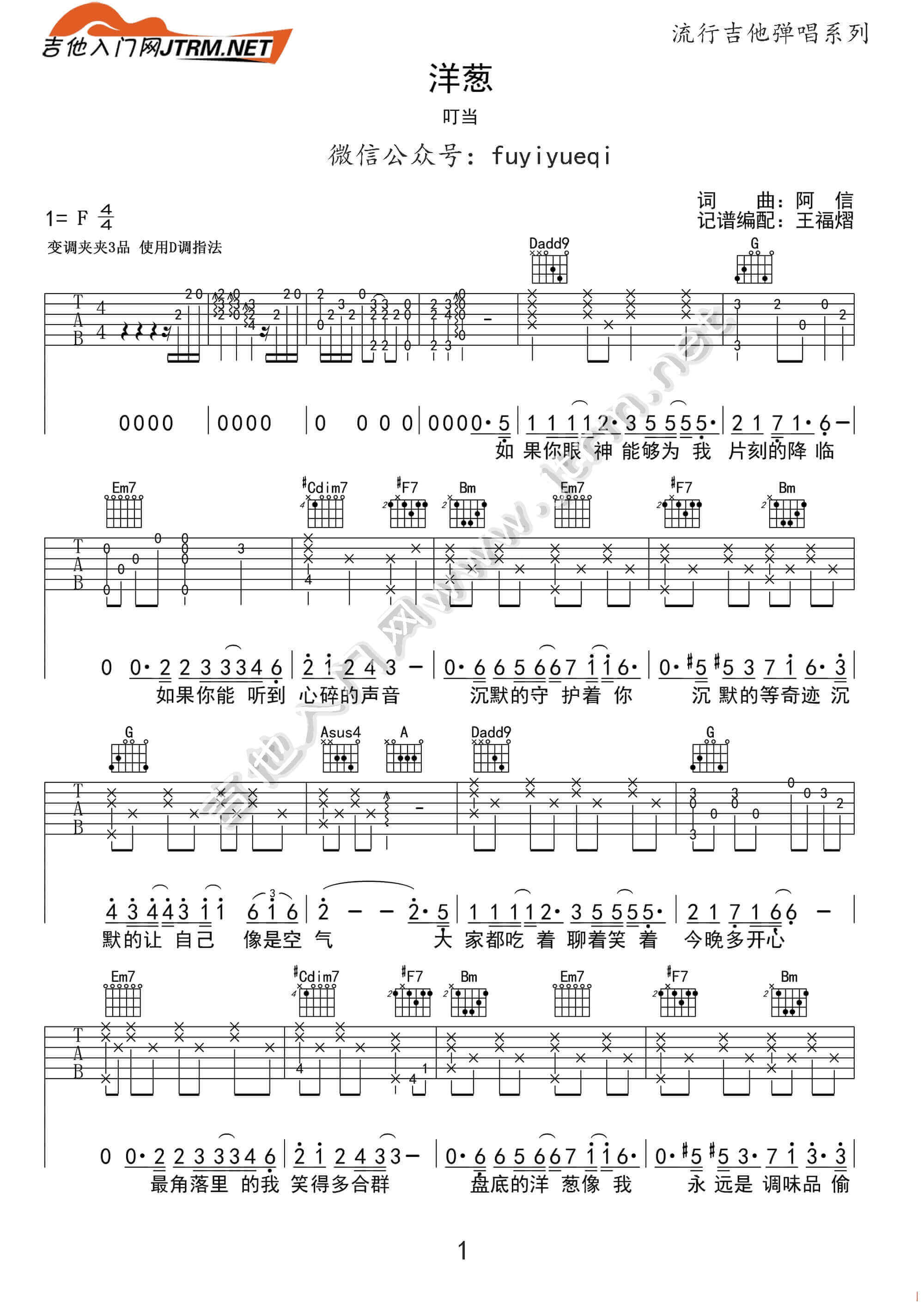 曲谱介绍: 洋葱吉他谱由王福熠编配完成,采用了D调指法。 吉他弹唱演示及视频教学