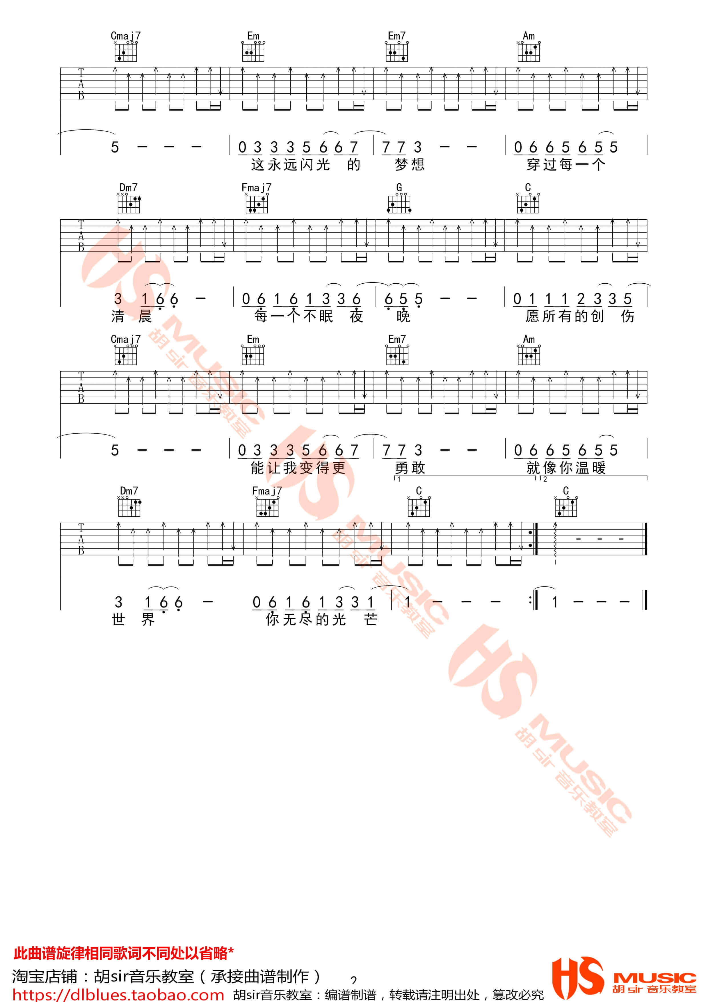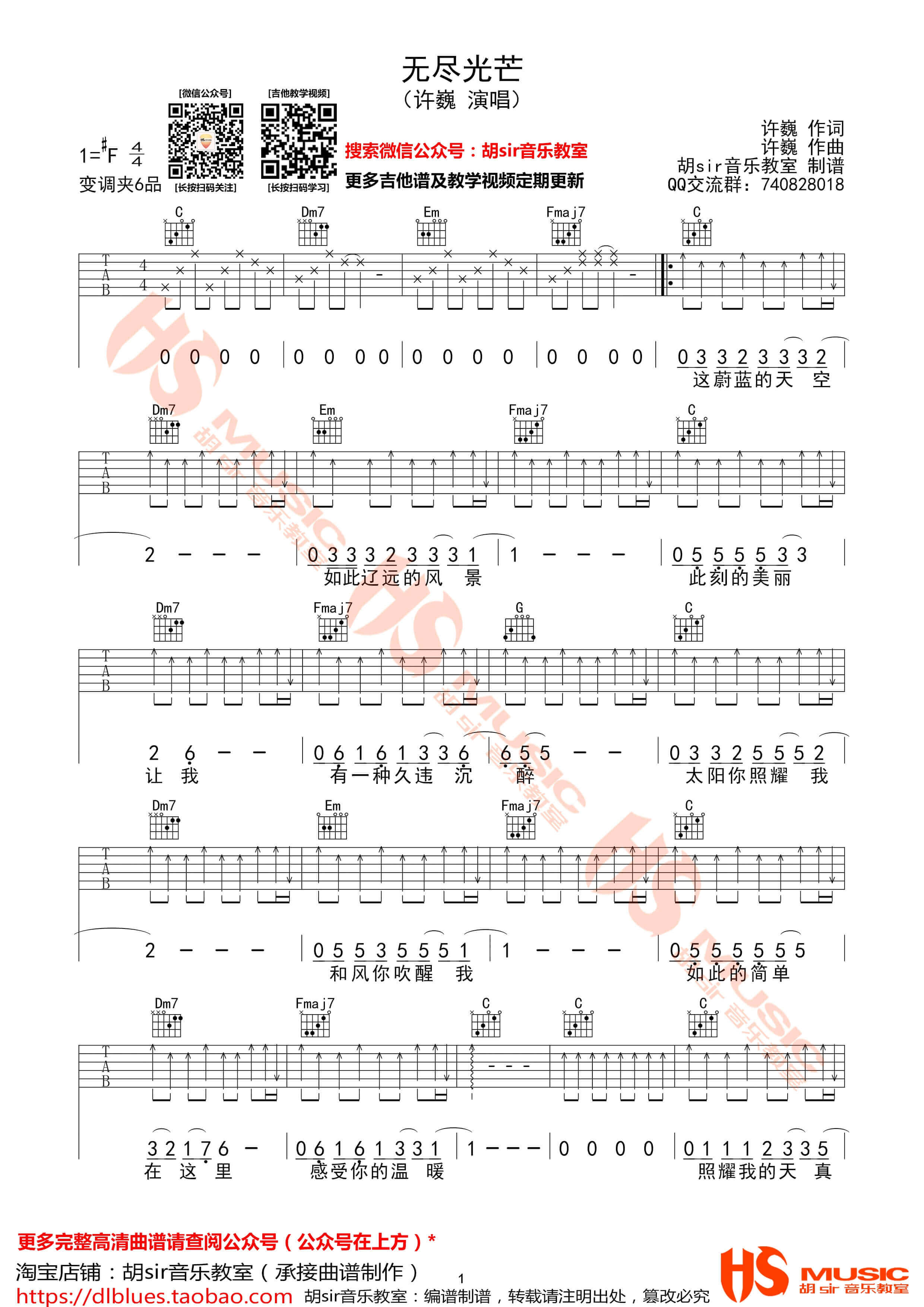 曲谱介绍: 无尽光芒吉他谱由胡sir音乐教室编配完成,采用了F调指法。许巍唱的这首无尽光芒可以说是令人积极向上的一首个,让人在歌里感受到一股力量,觉得对明天的生活又充满了向往,很阳光向上.
