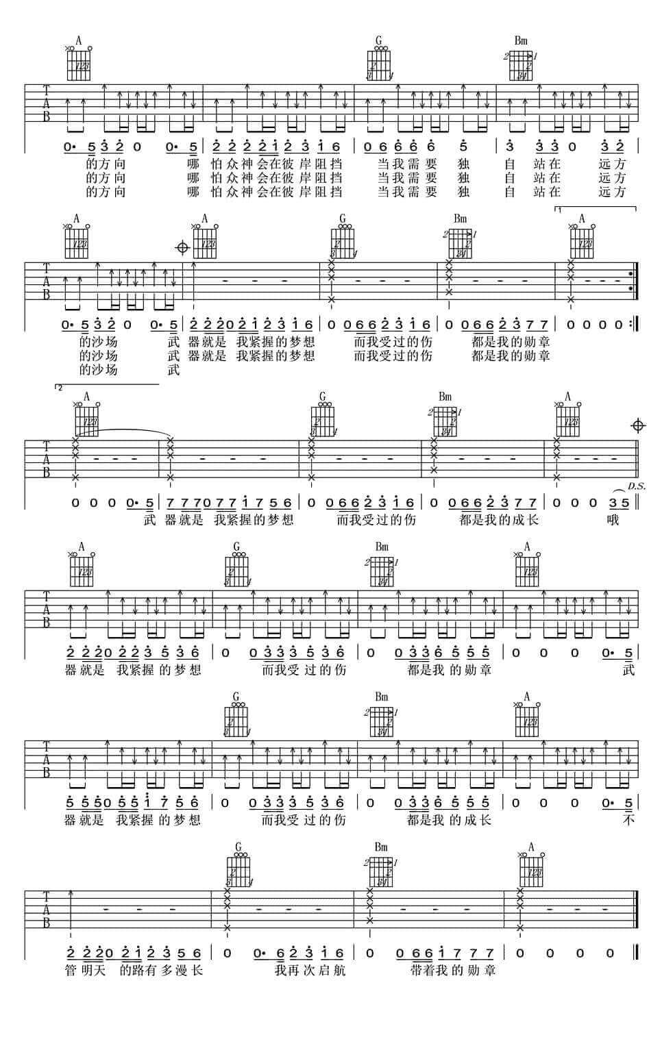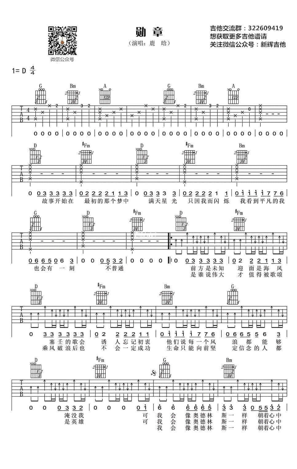 曲谱介绍: 勋章吉他谱采用了D调指法,由新辉吉他编配完成。这首是一首很励志的歌听了很有动力,然后有一种一往向前的动力,这首歌也有种荣耀的感觉,拼命向前,一往无畏的感觉,做一位勇敢的勇士。
