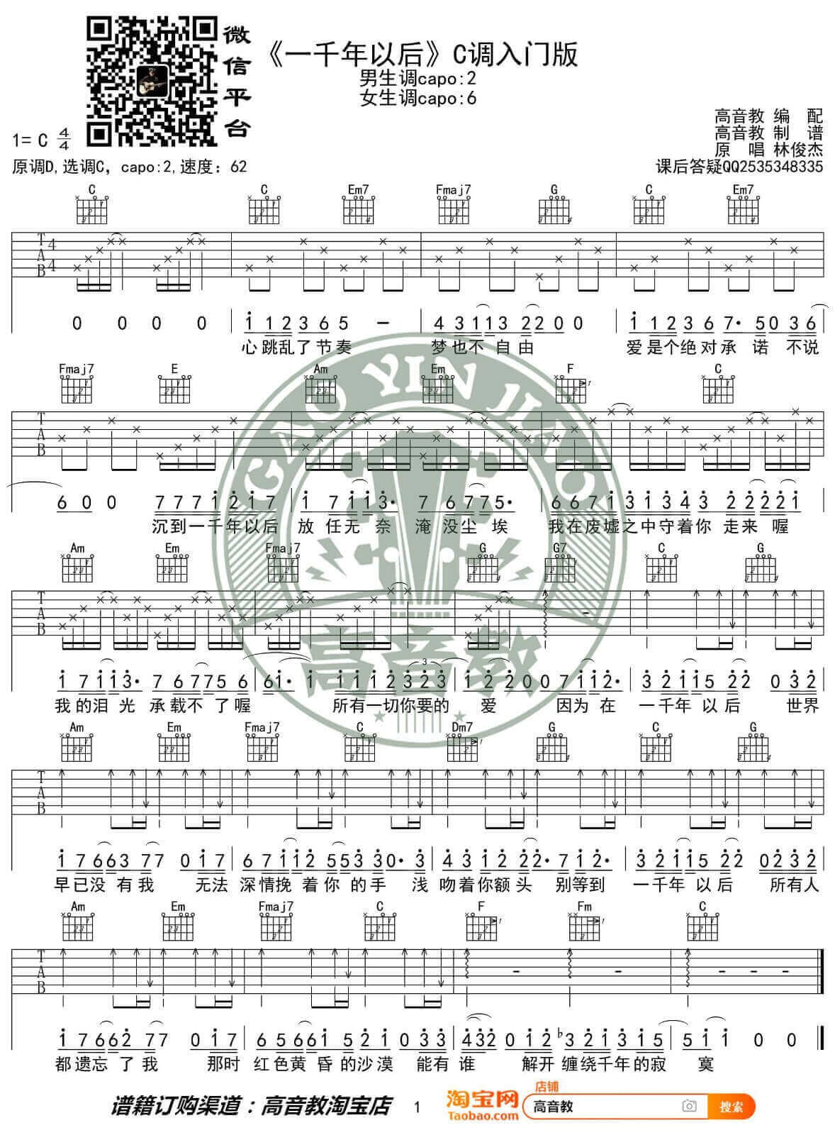 曲谱介绍: 一千年以后吉他谱采用了C调指法,由高音教编配完成。