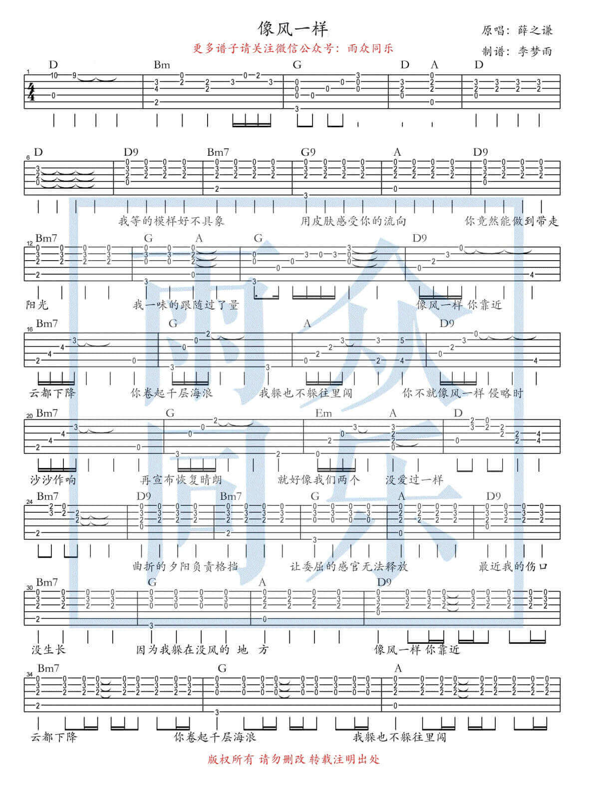 像风一样吉他谱 - 薛之谦 - D调吉他弹唱谱